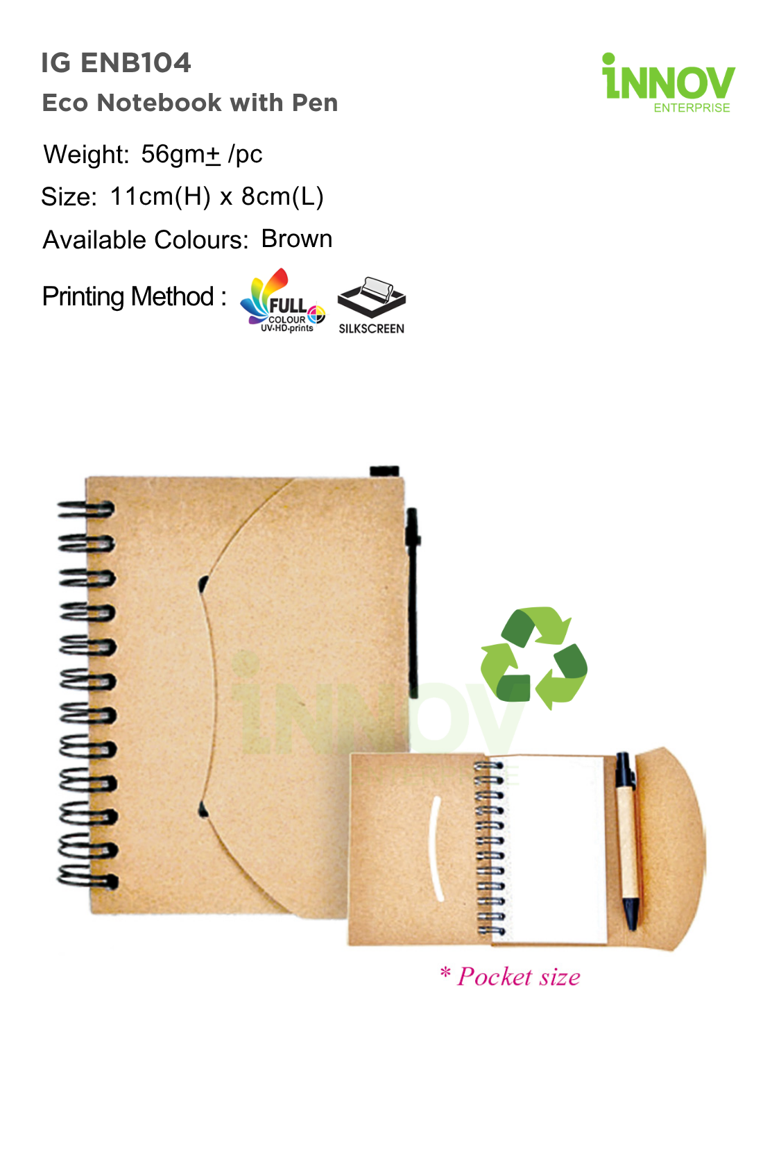 The IG ENB104 Eco Notebook with Pen is a compact Custom Eco Brown Notebook ideal for daily use and corporate branding. Supplied and customised by Innov Enterprise, it measures 11 cm × 8 cm with an approximate weight of 56 g, making it easy to carry anywhere.