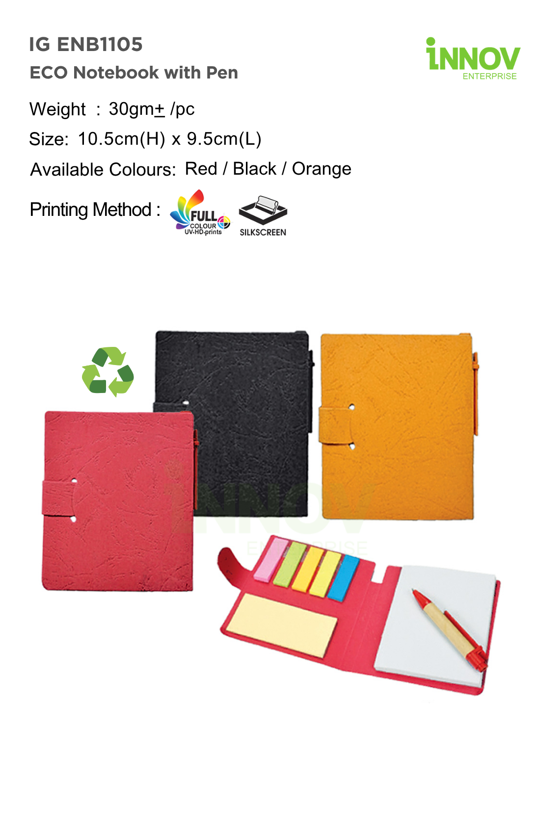 The IG ENB1105 ECO Notebook with Pen is a compact Custom Eco Pocket Notebook Set ideal for promotions, events, and corporate giveaways. Supplied and customised by Innov Enterprise, it measures 10.5 cm × 9.5 cm with an approximate weight of 30 g, making it ultra-portable.