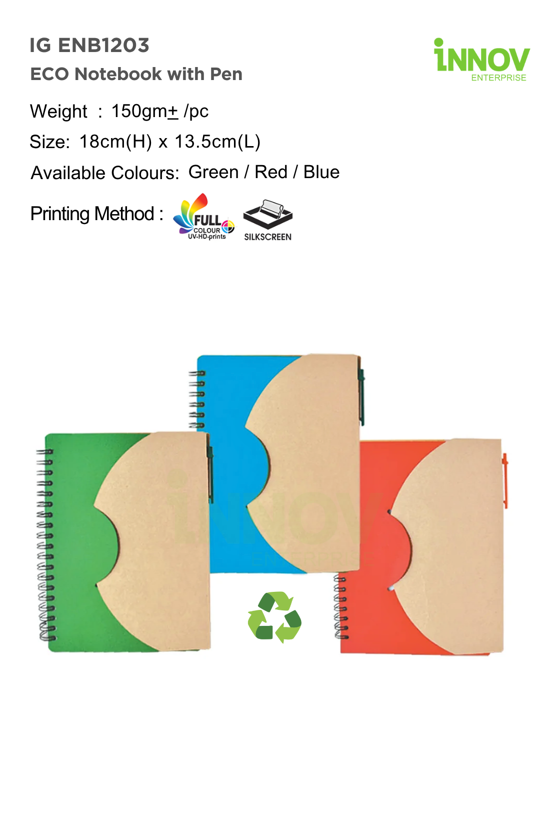 The IG ENB1203 ECO Notebook with Pen is a practical Custom Spiral Eco Journal ideal for sustainable corporate gifts and daily use. Supplied and customised by Innov Enterprise, it measures 18 cm × 13.5 cm with an approximate weight of 150 g, making it lightweight and easy to carry.