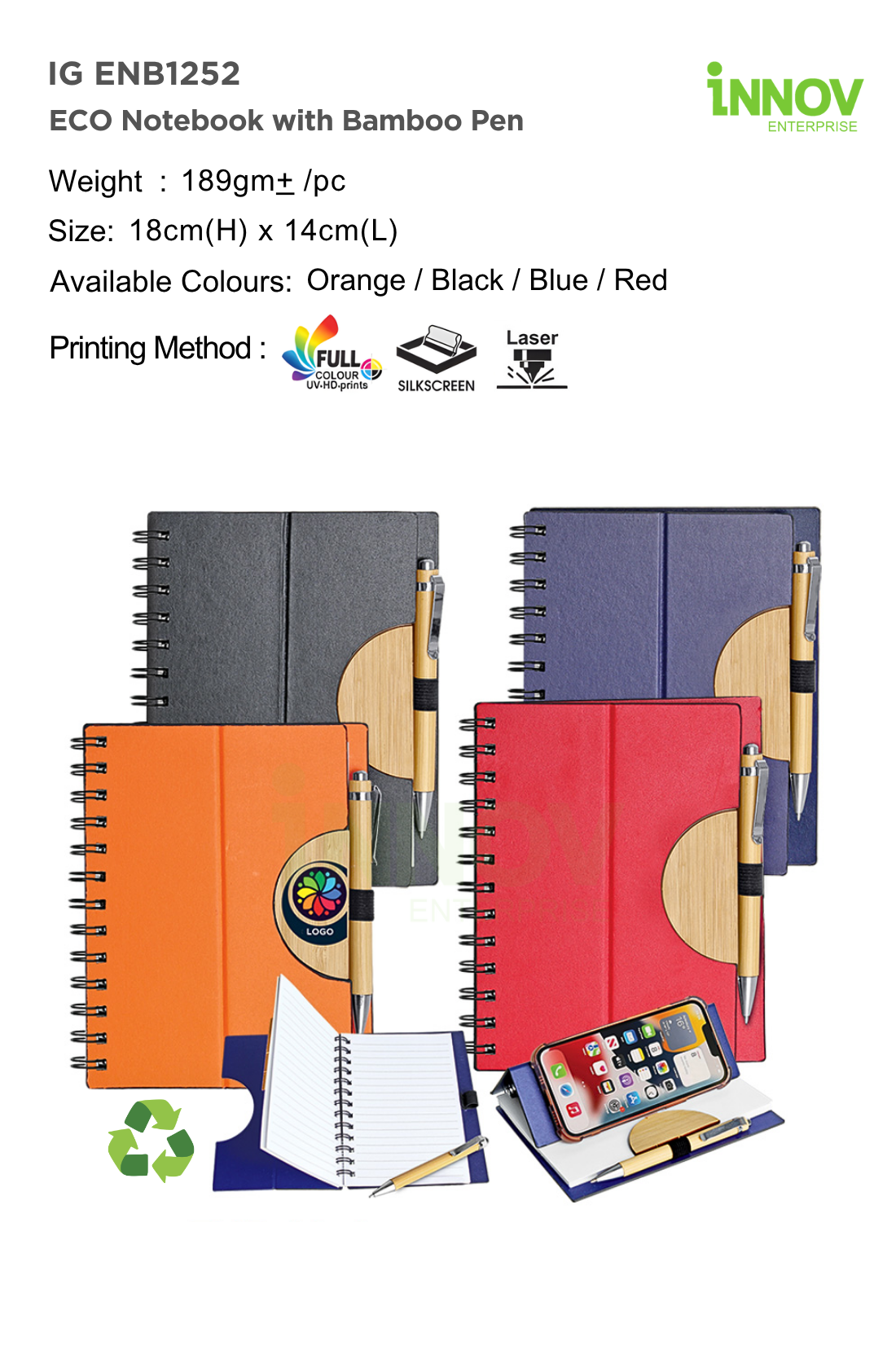 The IG ENB1252 ECO Notebook with Bamboo Pen is a premium Custom Eco Notebook with Bamboo Pen ideal for sustainable branding and corporate use. Supplied and customised by Innov Enterprise, it measures 18 cm × 14 cm with an approximate weight of 189 g, offering a sturdy and professional feel.