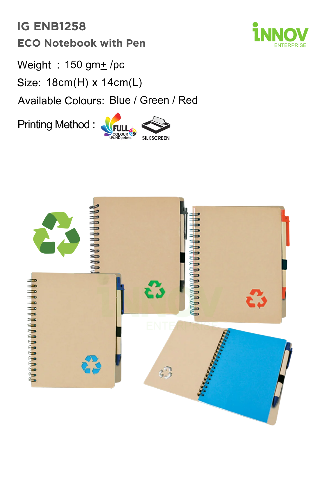 The IG ENB1258 ECO Notebook with Pen is a practical Customised Eco Stationery Set ideal for corporate branding and sustainable promotions. Supplied and customised by Innov Enterprise, it measures 18 cm × 14 cm with an approximate weight of 150 g, making it easy to carry for daily use.