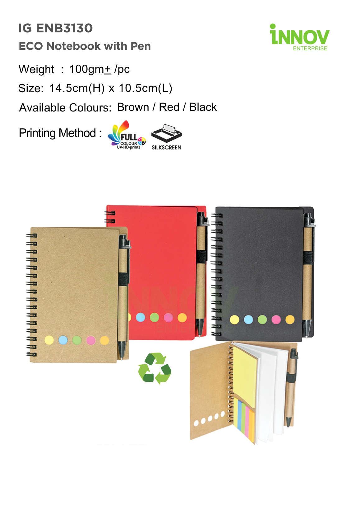 The IG ENB3130 ECO Notebook with Pen is a compact Custom Eco Notebook for Souvenirs ideal for events, corporate giveaways, and promotions. Supplied and customised by Innov Enterprise, it measures 14.5 cm × 10.5 cm with an approximate weight of 100 g, making it easy to carry.