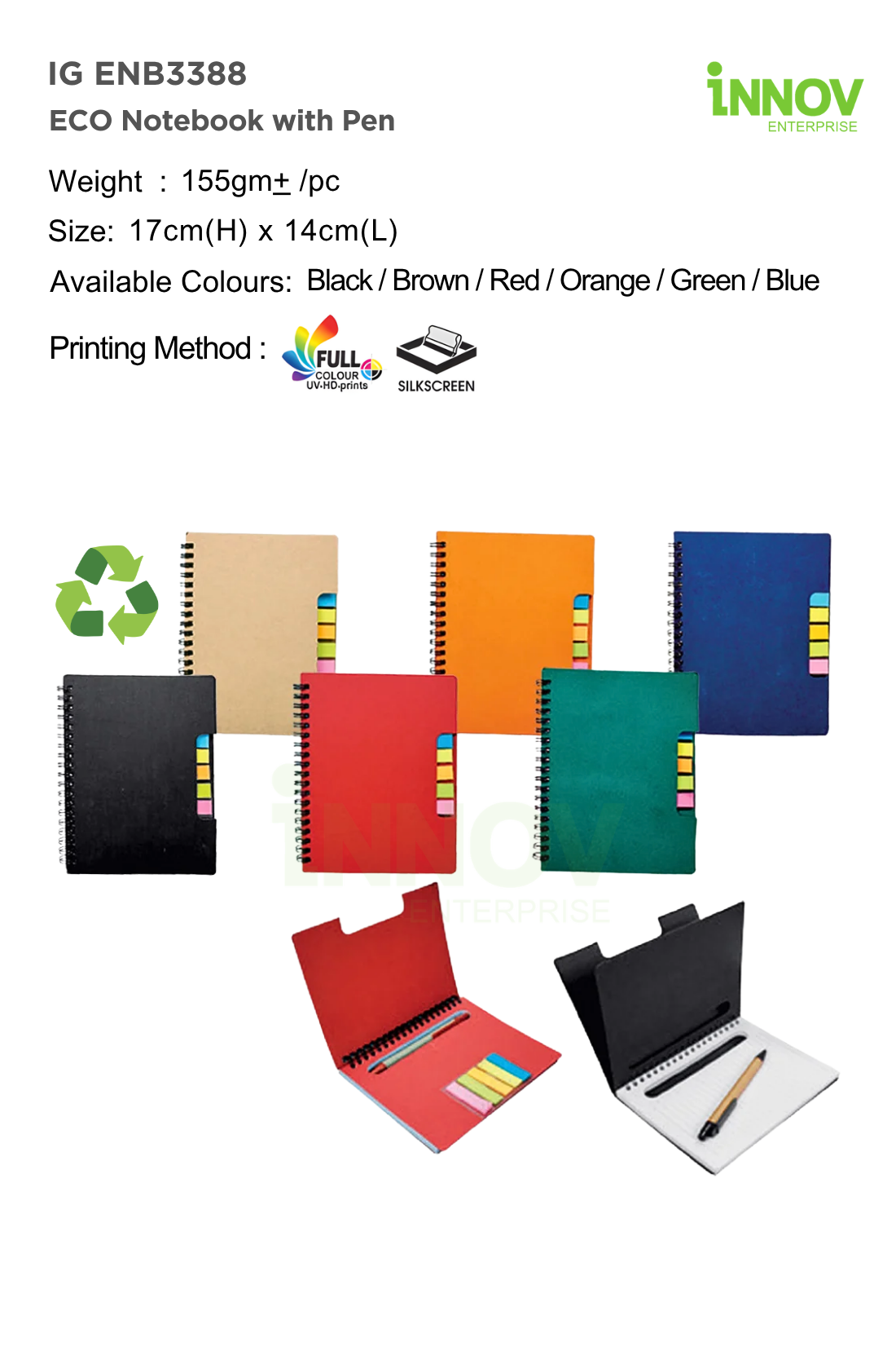The IG ENB3388 ECO Notebook with Pen is a practical Eco Stationery Set Printing solution ideal for corporate use and promotions. Supplied and customised by Innov Enterprise, it measures 17 cm × 14 cm with an approximate weight of 155 g, making it easy to carry for daily use.