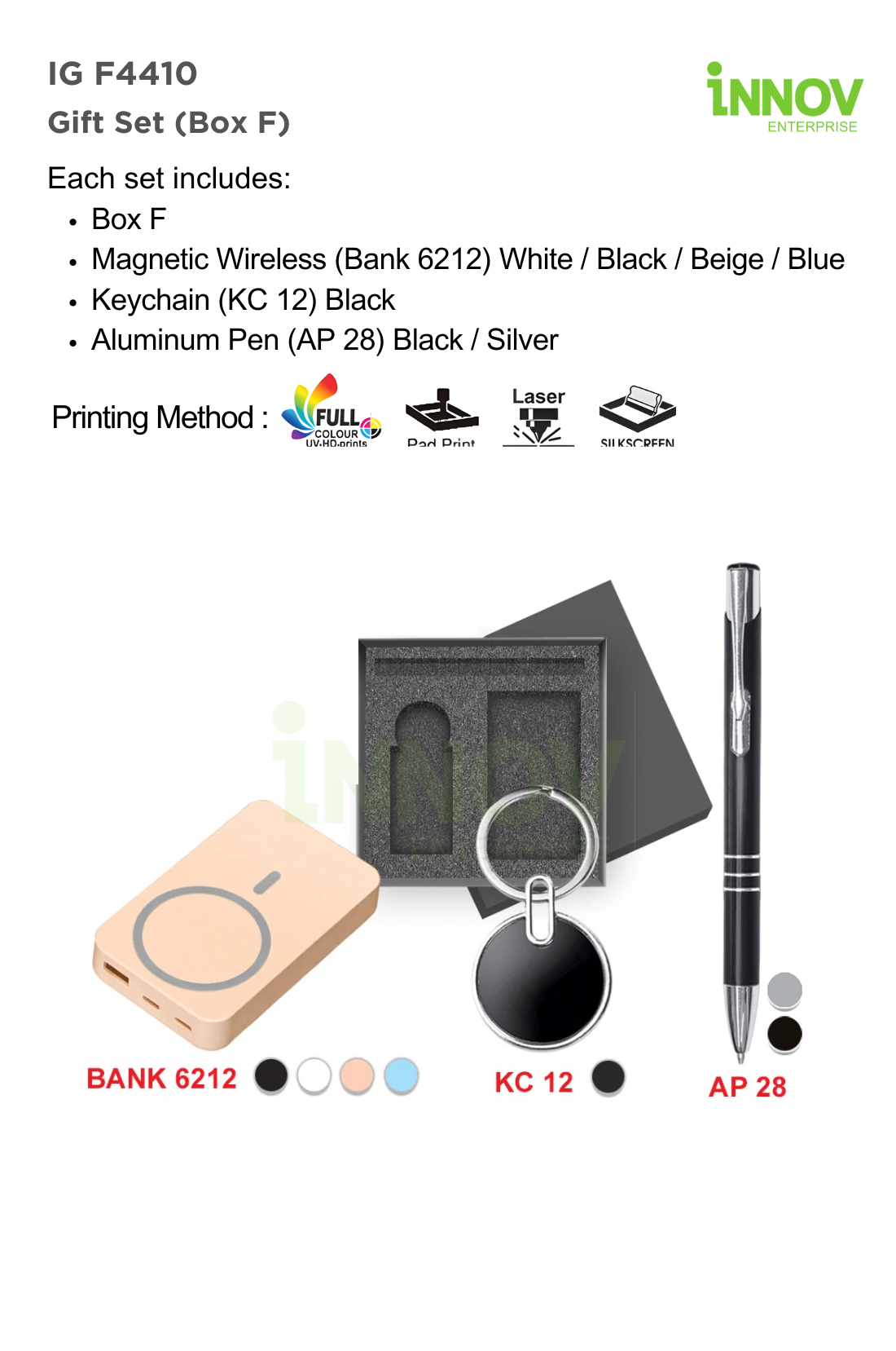 The IG F4410 Gift Set (Box F) is a practical Wholesale Gift Set with Logo designed for corporate campaigns, promotional giveaways, and business events. Supplied by Innov Enterprise, each set includes Box F, a Bank 6212 Magnetic Wireless Charger/Power Bank, KC 12 Metal Keychain, and AP 28 Aluminium Pen, neatly arranged in a premium presentation box.