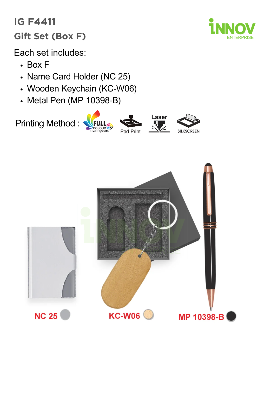 The IG F4411 Gift Set (Box F) is a sleek Personalised Souvenir Set designed for corporate branding, promotional campaigns, and appreciation gifts. Supplied and Customised by Innov Enterprise, each set includes Box F, NC 25 Name Card Holder, KC-W06 Wooden Keychain, and MP 10398-B Metal Pen, neatly arranged in a premium presentation box.