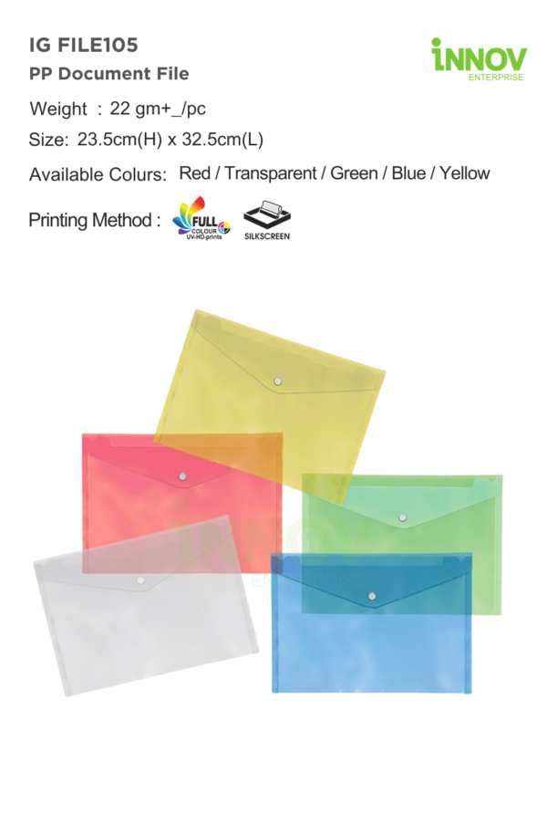 The IG FILE105 PP Document File is a lightweight and practical Custom Document File designed for organising A4 documents in offices, events, and corporate use. Made from durable polypropylene (PP), it offers better flexibility and tear resistance than paper folders, while the snap-button flap closure keeps documents secure during daily handling. Innov Enterprise provides professional customisation to transform this file into a functional branded stationery item.