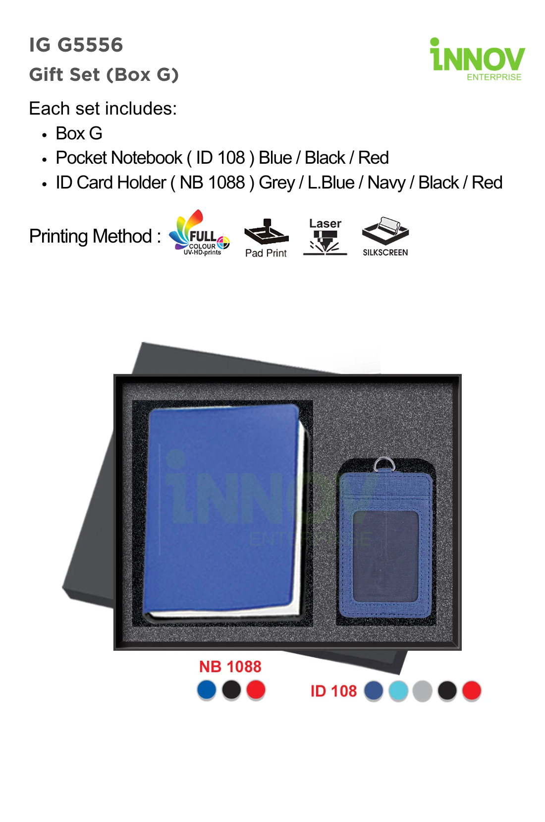 The IG G5556 Gift Set (Box G) is a practical Corporate Notebook Gift Set designed for business events, staff onboarding, and corporate promotions. Supplied and Customised by Innov Enterprise, each set includes Box G, NB 1088 Pocket Notebook, and ID 108 Card Holder, neatly arranged in a premium presentation box.