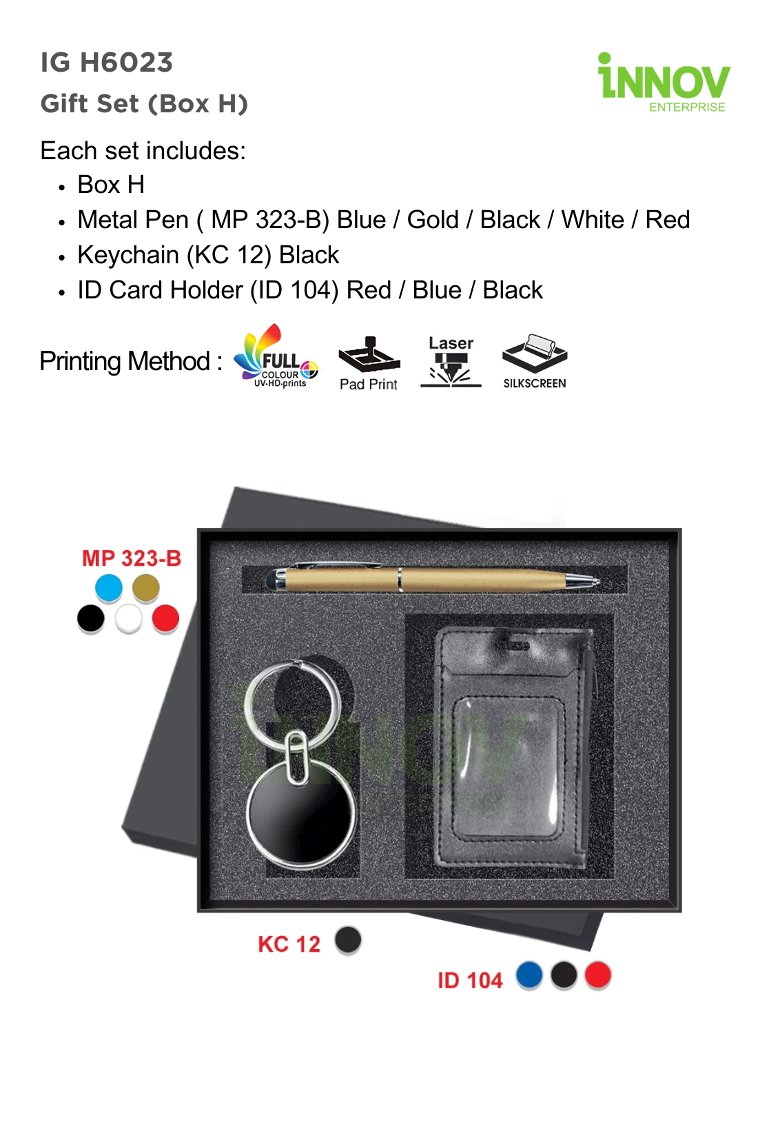The IG H6023 Gift Set (Box H) is a practical Custom Corporate Gift Set designed for business branding, employee welcome kits, and corporate events. Supplied and Customised by Innov Enterprise, each set includes Box H, MP 323-B Metal Pen, KC 12 Keychain, and ID 104 Card Holder, neatly arranged in a premium presentation box.