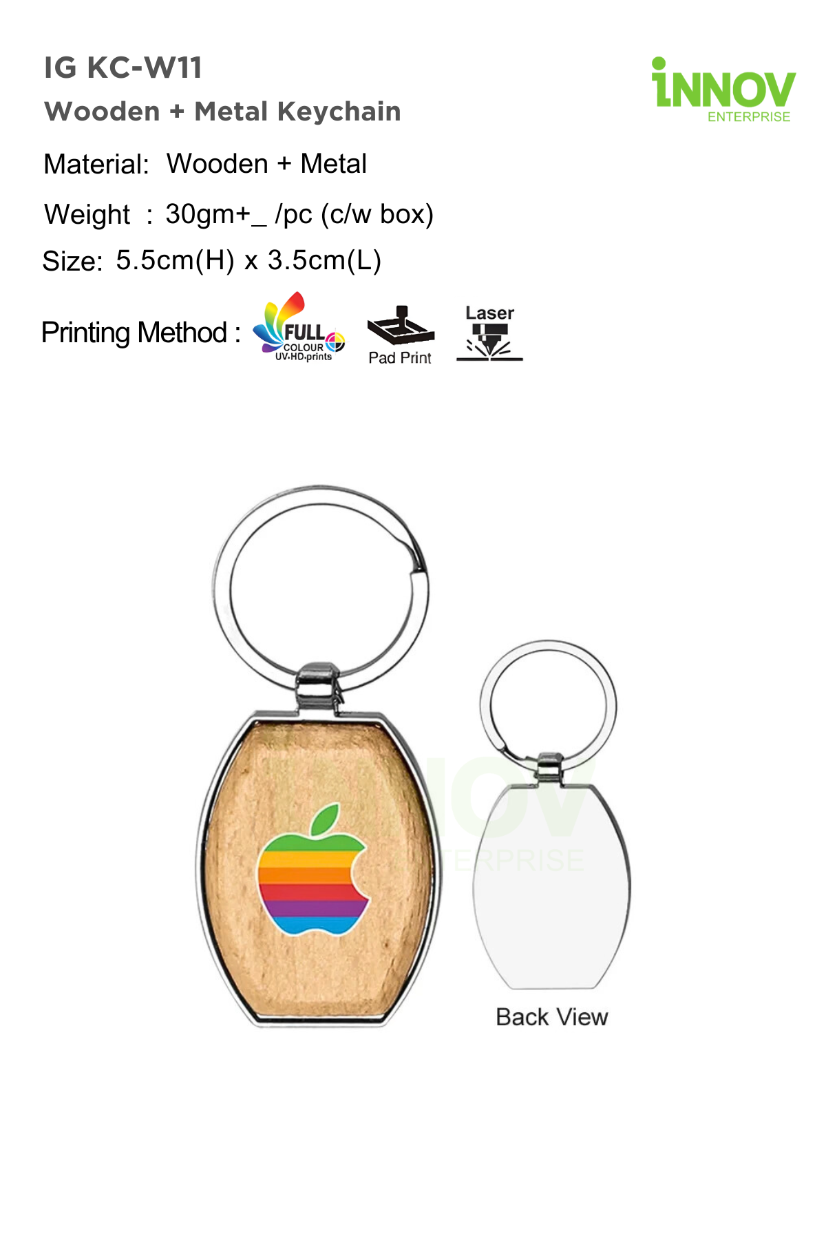 The IG KC-W11 Wooden + Metal Keychain is a refined Custom Keychain for Gift, designed and supplied by Innov Enterprise for corporate branding, events, and personal gifting. Made from natural wood with a polished metal frame, it offers a warm yet professional look suitable for everyday use.