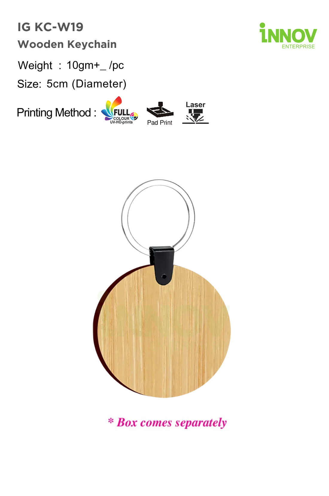 Weighing approximately 10 g ± per piece and measuring 5 cm (diameter), The sturdy metal ring and connector ensure reliable use over time. (Box comes separately.) Innov Enterprise provides professional customisation to transform this item into a versatile wooden keyring for promotions, events, and everyday brand visibility.