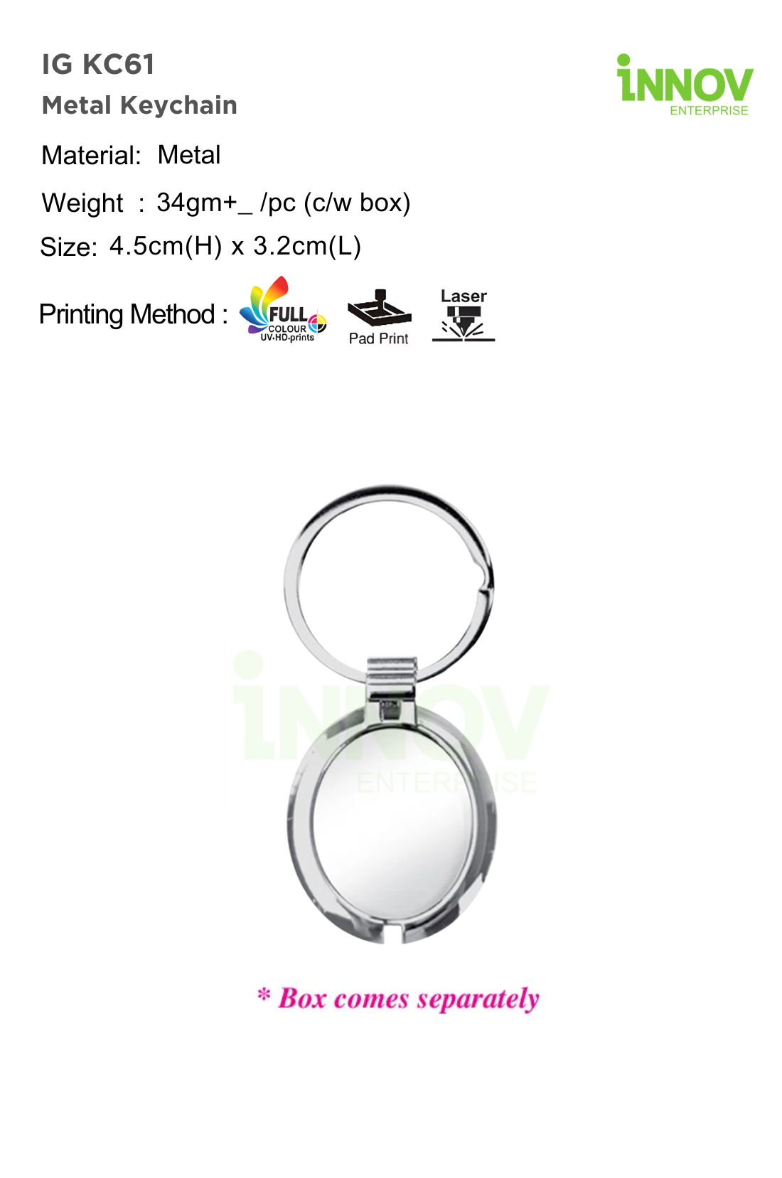 The IG KC61 Metal Keychain is a clean and versatile Custom Metal Keyring designed for corporate promotions, office use, and event giveaways. Crafted from durable metal with a round silver finish, it delivers a timeless, professional look that enhances brand visibility while remaining suitable for everyday carry. Supplied by Innov Enterprise, this keyring’s smooth circular face provides a clear, balanced area for logos or names—ideal for consistent branding across campaigns.