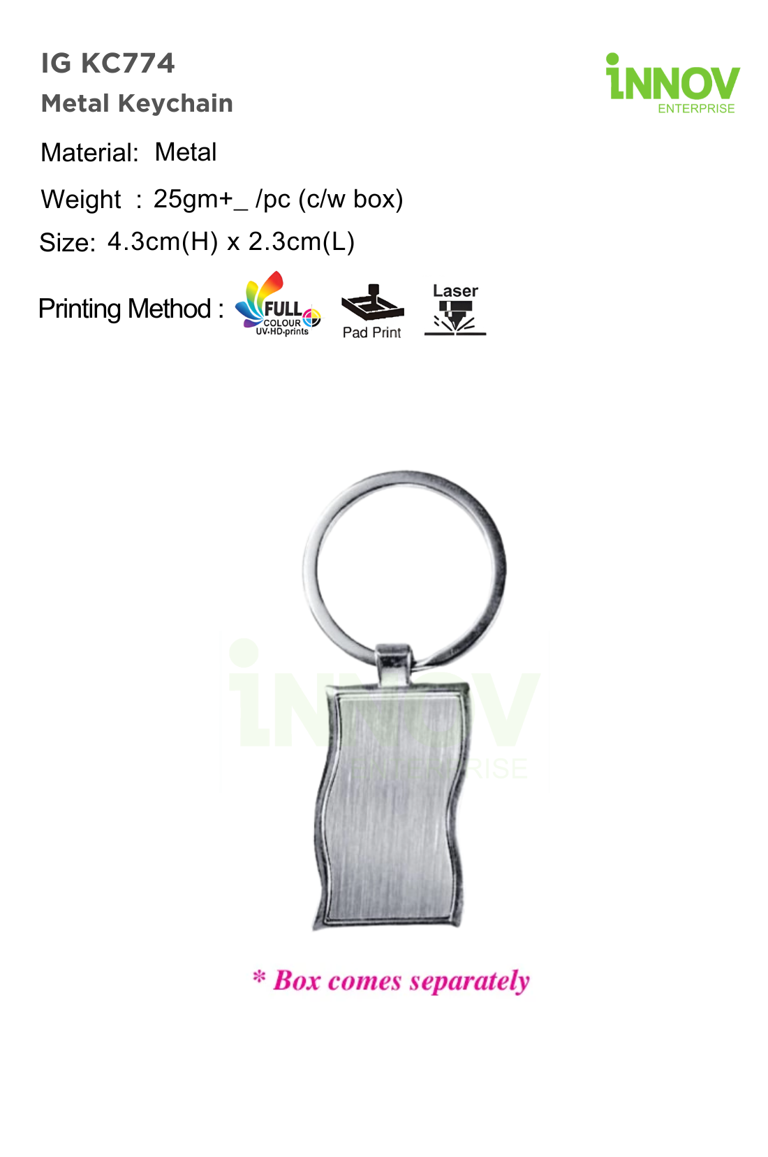 Measuring 4.3 cm(H) × 2.3 cm(L) and weighing approximately 25 g per piece, this keychain is lightweight yet durable—ideal for bulk promotions and corporate use. Box supplied separately.