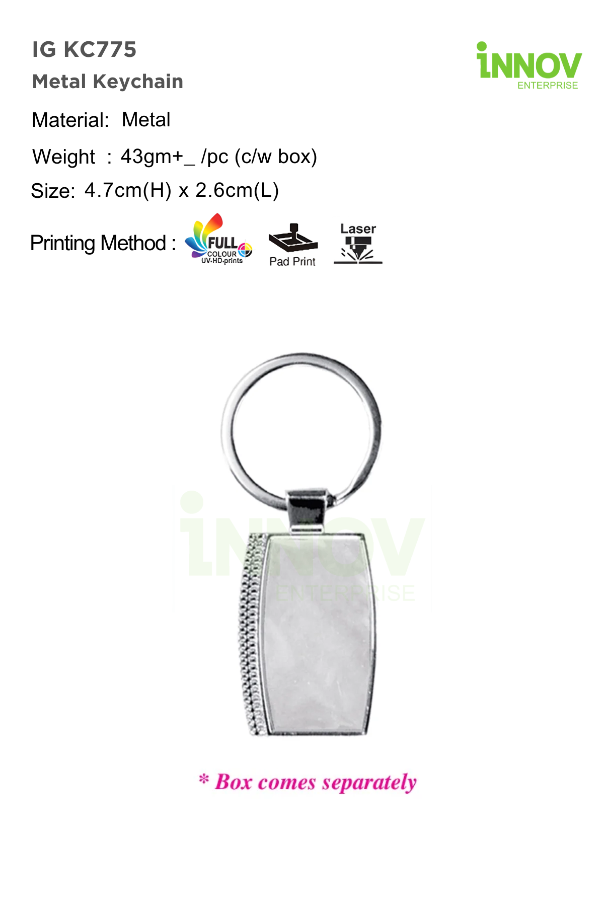 The IG KC775 Metal Keychain is a refined Custom Metal Keychain for Souvenir, ideal for events, promotions, and everyday gifting. Supplied by Innov Enterprise, it features a polished silver finish with a subtle textured side detail for a professional look.