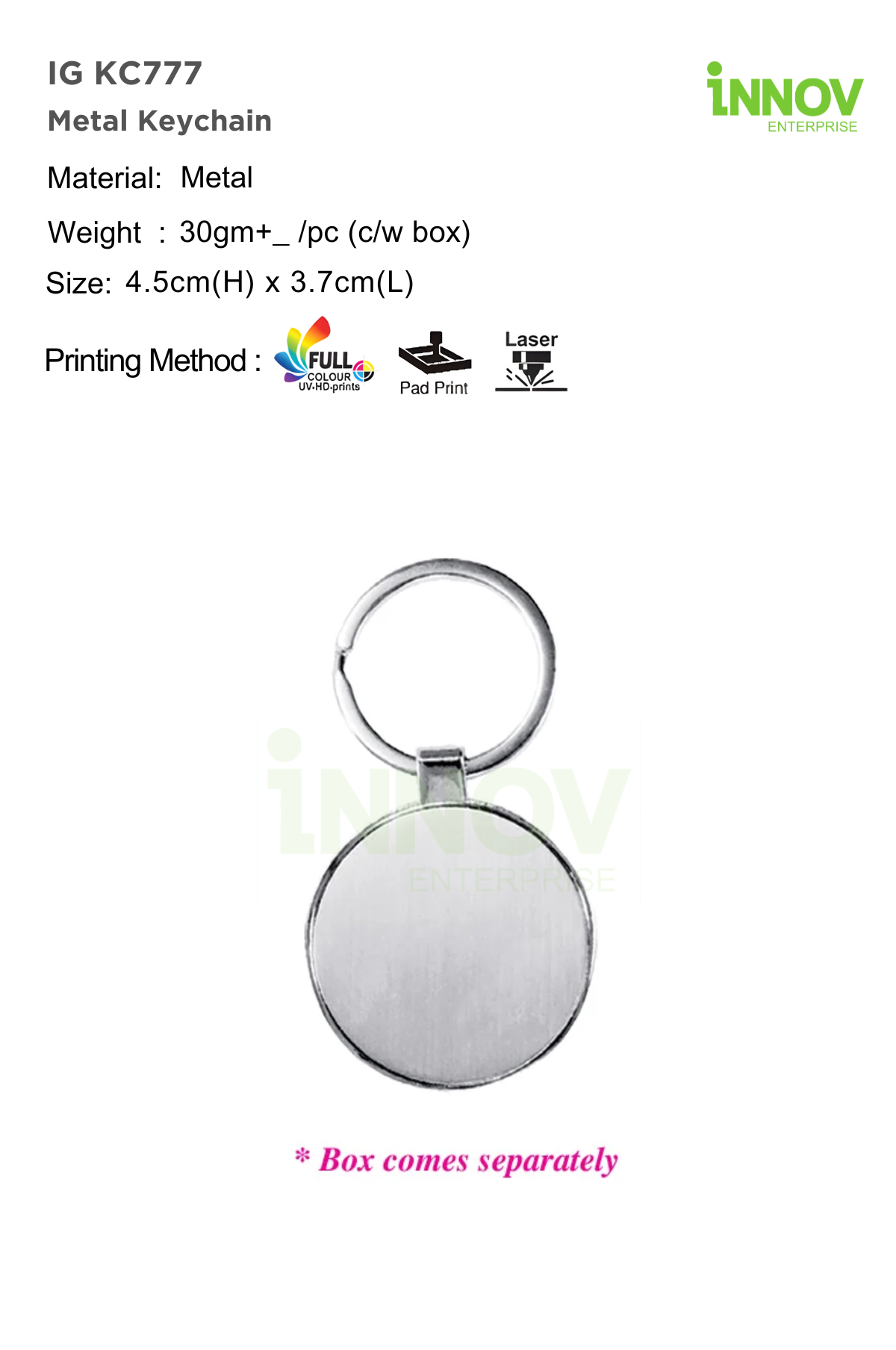 The IG KC777 Metal Keychain is a clean and timeless Custom Metal Keychain For Gifts, ideal for business, office, and corporate gifting. Offered by Innov Enterprise, this keychain features a round silver metal design with a smooth brushed surface that provides a generous branding area while maintaining a professional, understated look.