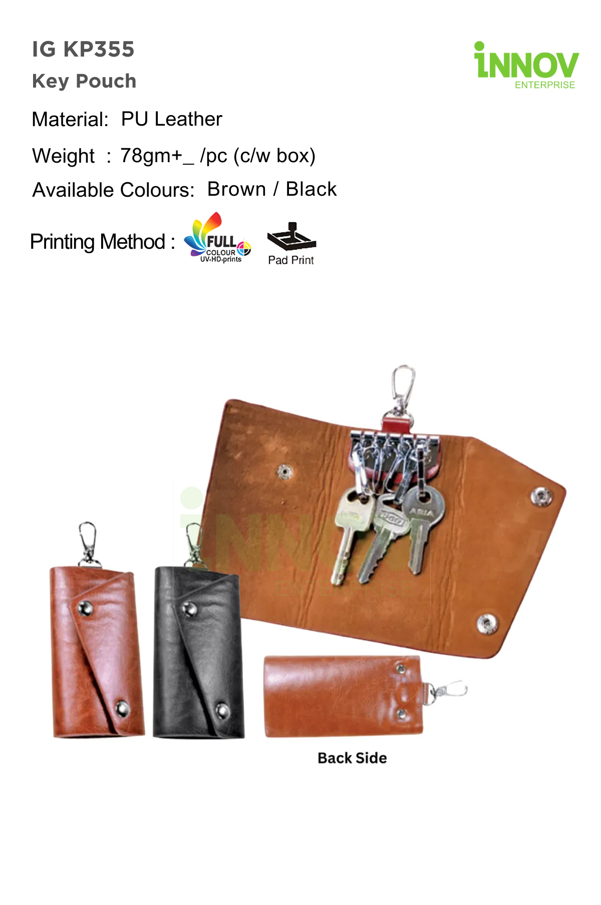 The IG KP355 Key Pouch is a refined Custom Leather Key Pouch for everyday organisation, corporate gifting, and professional branding. Supplied by Innov Enterprise, it is made from durable PU leather that offers a premium look with easy maintenance. Designed with a snap-button closure and an internal metal key ring with multiple hooks, it keeps keys secure and neatly organised. Weighing approximately 78 g per piece (with box) and available in 2 colours, the IG KP355 is a practical and stylish Custom Leather Key Pouch suitable for staff gifts, client giveaways, and business use.