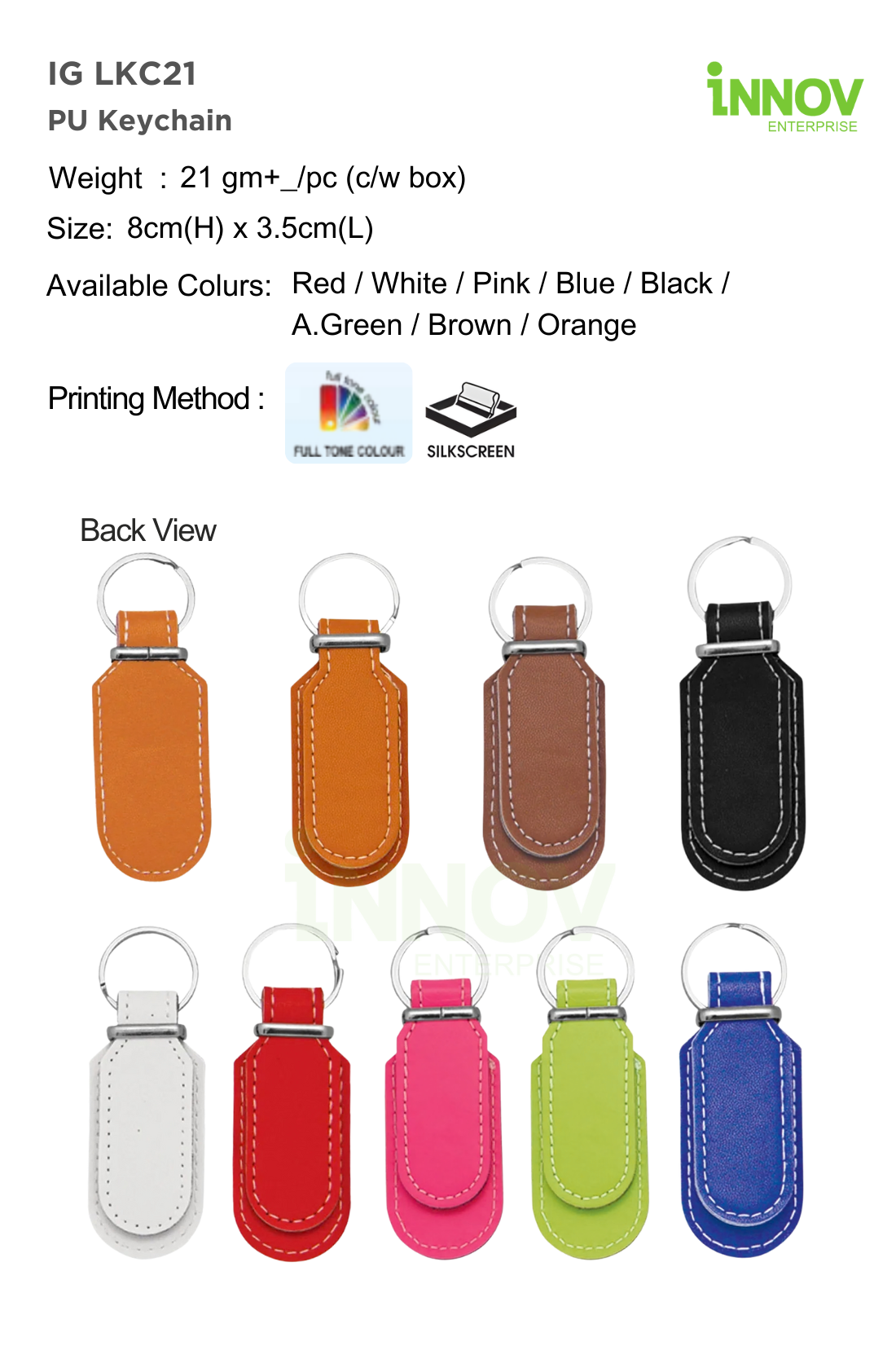 Weighing approximately 21 g per piece (with box) and measuring 8 cm (H) × 3.5 cm (L), the IG LKC21 is compact yet substantial enough to feel premium in hand. Available in Eight Colours, the wide colour selection allows easy matching with brand colours. Innov Enterprise provides professional customisation to ensure your Custom PU Keychain delivers strong and consistent brand visibility.