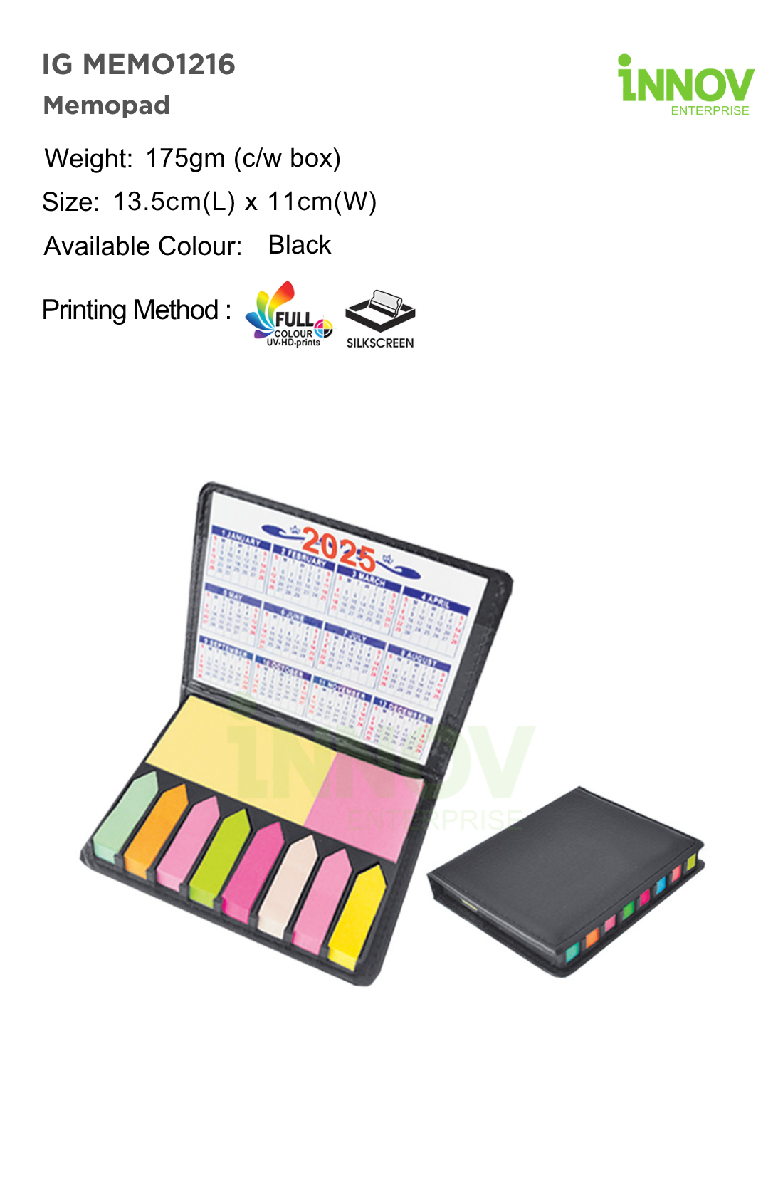 The IG MEMO1216 ECO Memopad is a compact Personalised Memopad with Calendar ideal for daily planning and corporate branding. Supplied and customised by Innov Enterprise, it measures 13.5 cm × 11 cm, making it easy to carry or place on desks.