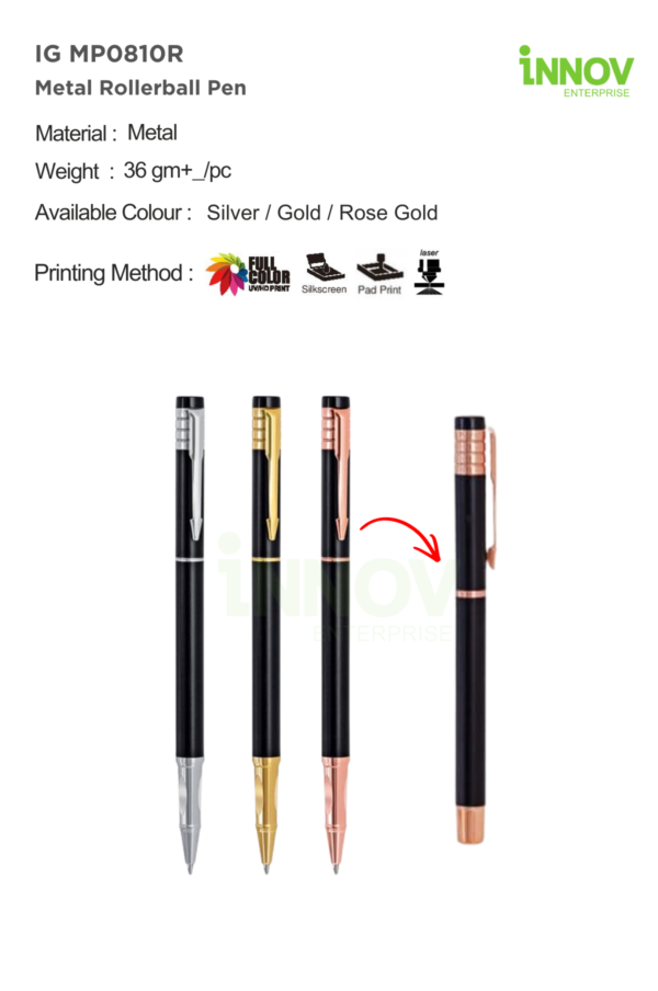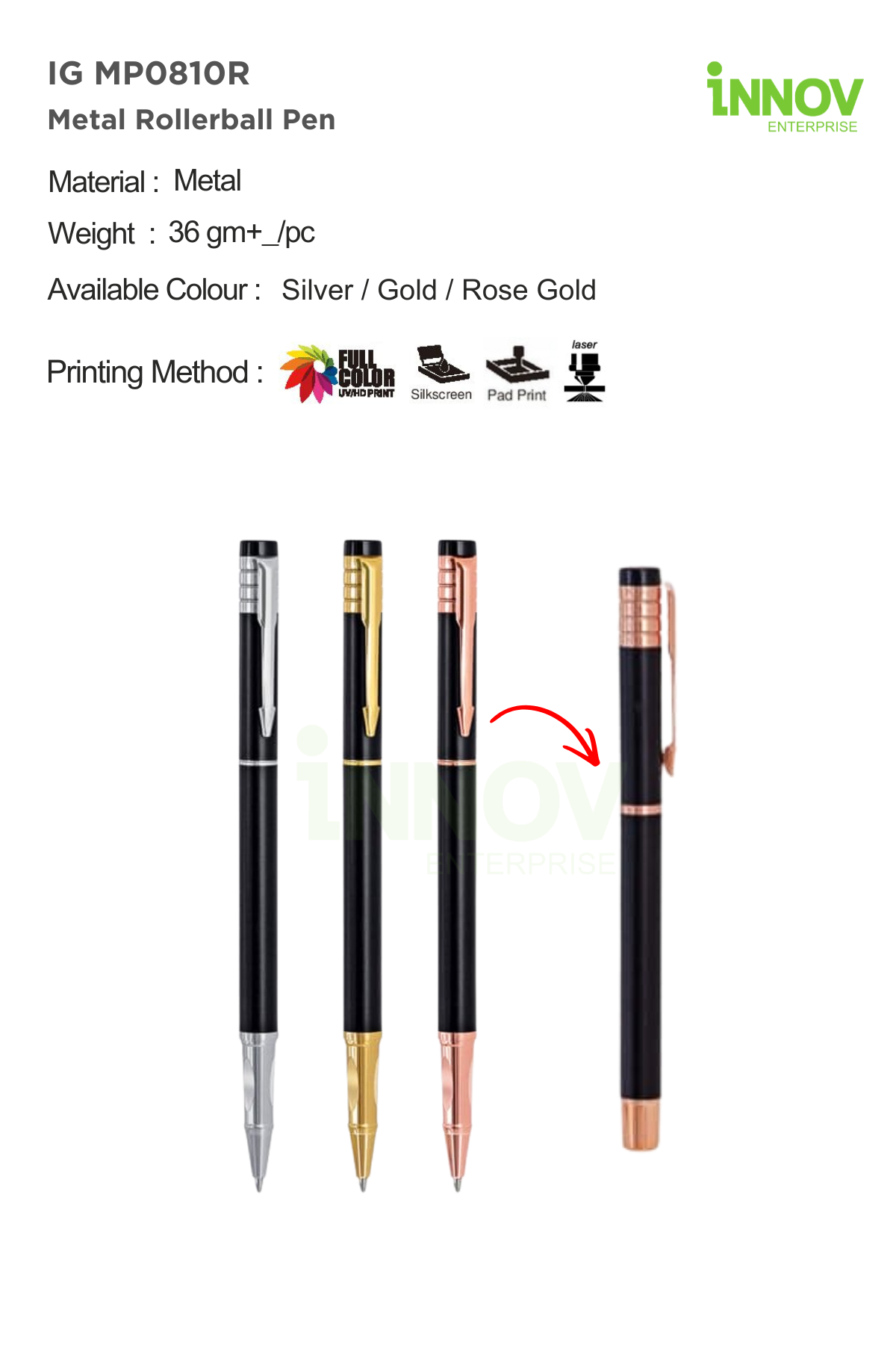 The IG MP0810R Metal Rollerball Pen is a sleek and modern writing instrument designed for organisations seeking reliable Metal Pen Logo Printing Services for corporate branding and events. Crafted from metal with a slim black body and refined metallic accents available in silver, gold, and rose gold, this pen delivers a contemporary executive look while remaining comfortable for daily use. The contrasting trims enhance logo visibility, ensuring branded messages appear sharp and professional.