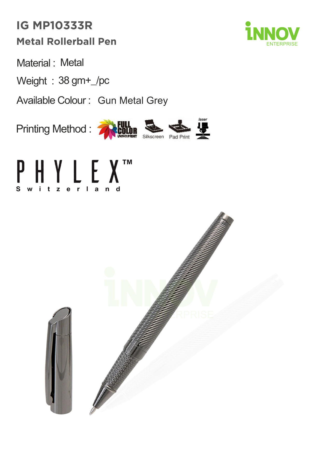 Part of the PHYLEX Switzerland collection, this rollerball pen reflects understated elegance and dependable performance—making it a strong choice for premium corporate branding and professional stationery, professionally customised by Innov Enterprise.