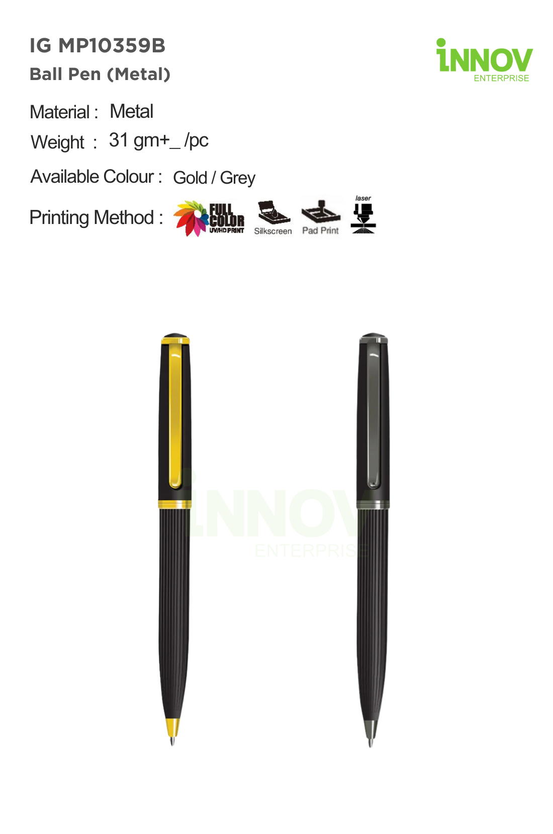 Order Now! Upgrade your corporate branding with the IG MP10359B Metal Ball Pen. Add to quote or contact Innov Enterprise today for customised pricing and complimentary design support.