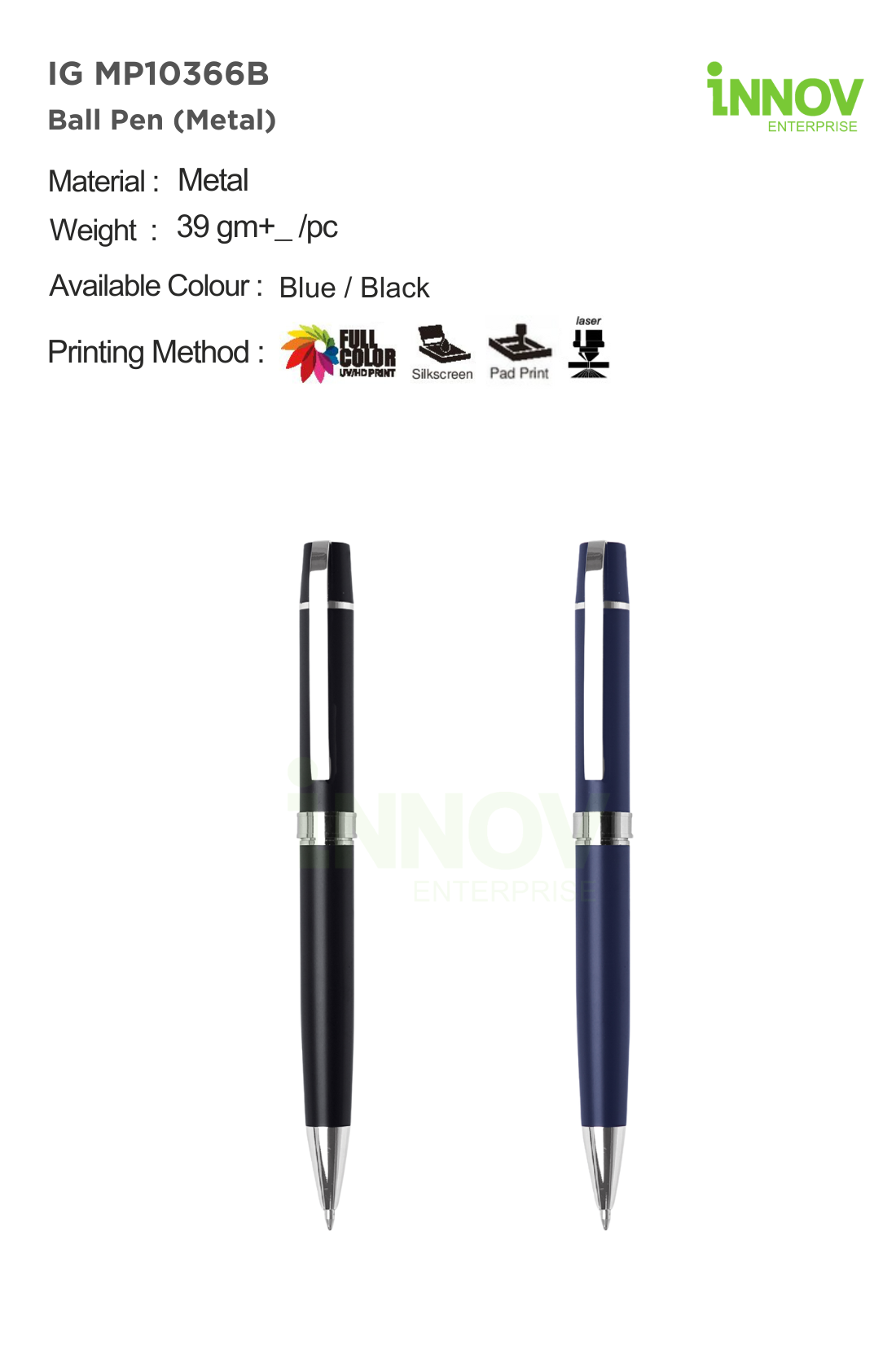 Order Now! Enhance your branding with the IG MP10366B Metal Ball Pen. Add to quote or contact Innov Enterprise today for a customised quotation and complimentary design support.