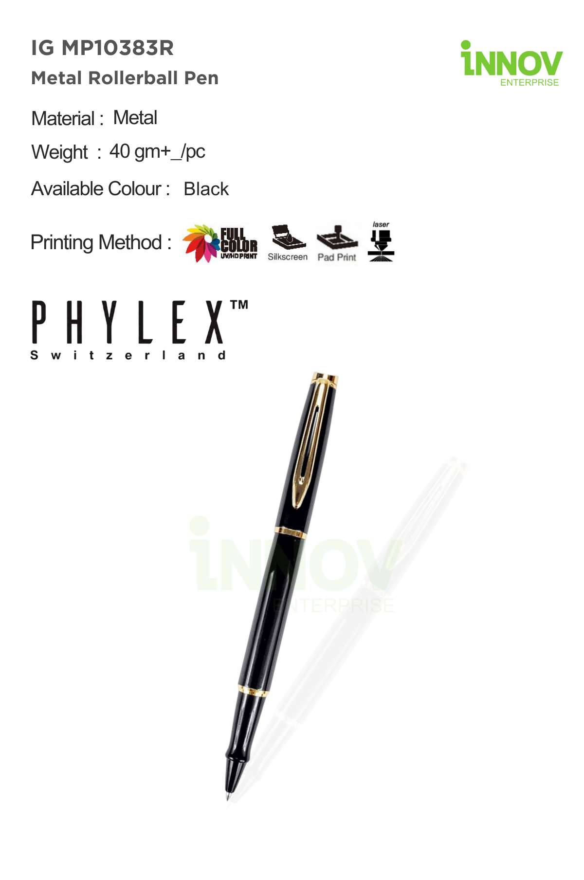 Part of the PHYLEX Switzerland collection, this rollerball pen represents understated luxury and reliable performance. Innov Enterprise offers professional customisation, applying your logo or message precisely to create a refined, gift-ready pen for premium corporate branding.