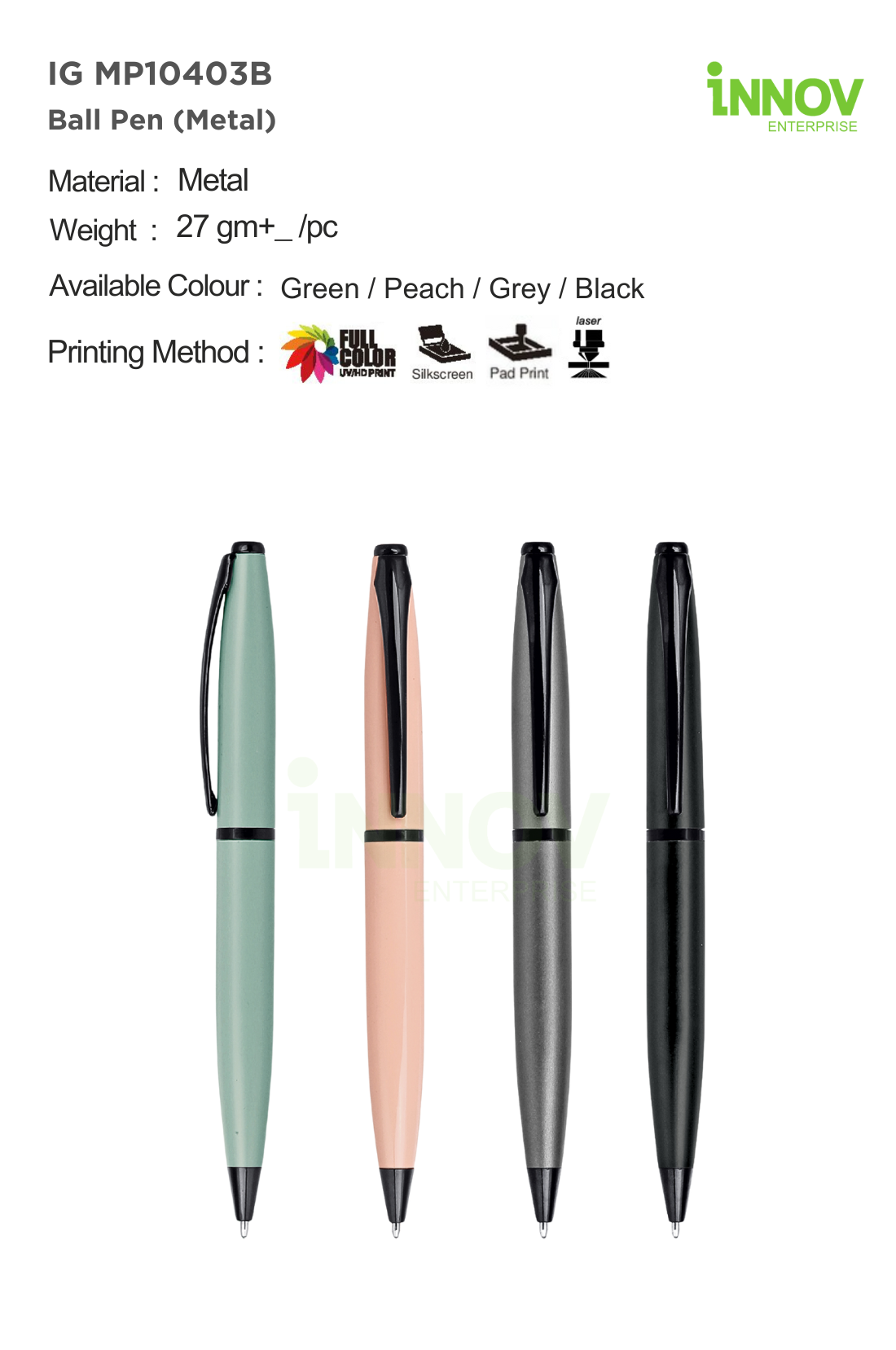 Innov Enterprise provides professional branding services for the IG MP10403B Metal Ball Pen, offering: