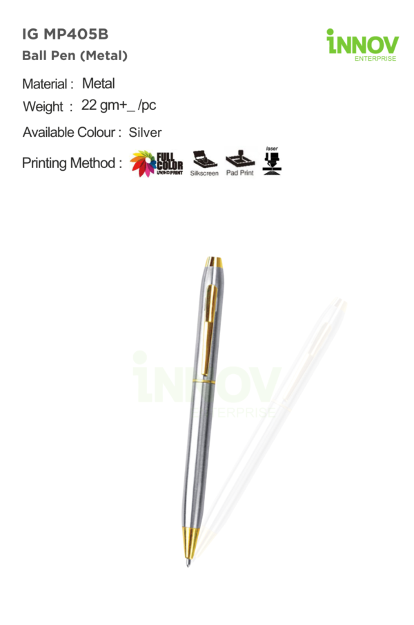 The IG MP405B Metal Ball Pen is a sleek and refined Custom Engraved Metal Pen designed for corporate branding, professional gifting and everyday office use. Crafted from durable metal, this pen features a polished silver body enhanced with elegant gold trims, creating a premium look that stands out during meetings, signing sessions and executive presentations. Innov Enterprise enables personalised printing on the smooth metal surface, ensuring your brand remains visible and appreciated as a functional gift.