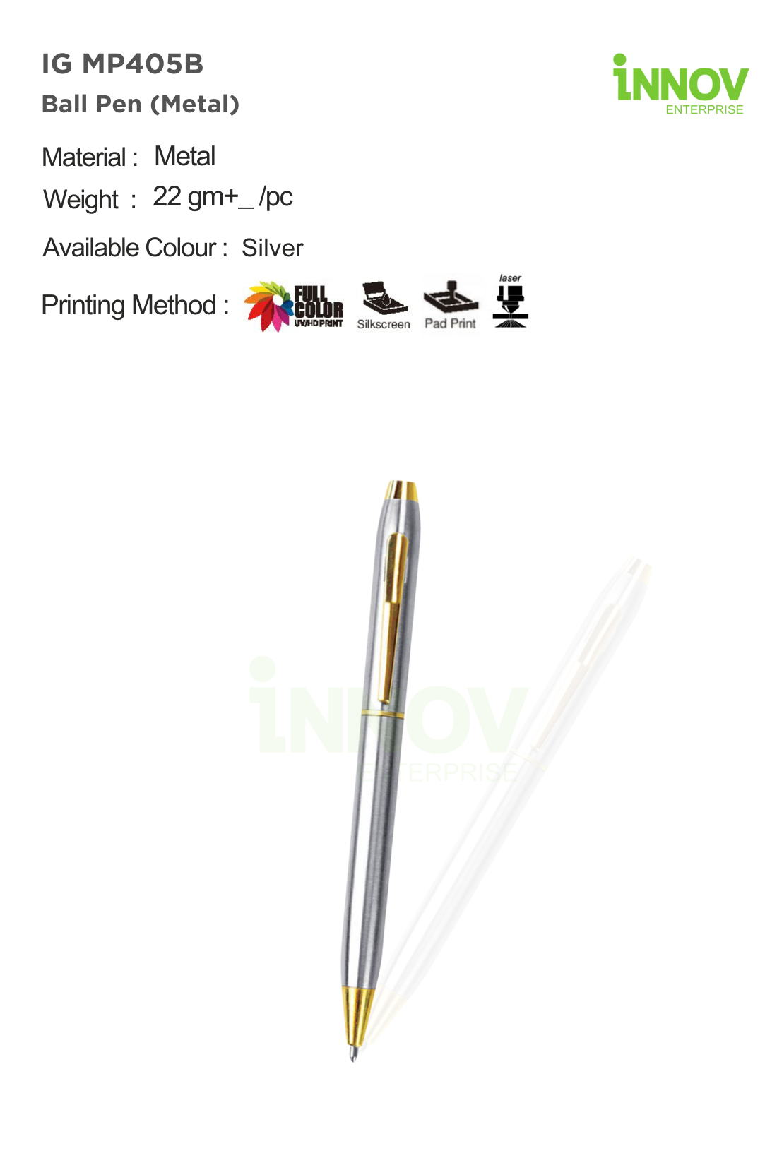 Order Now! Enhance your corporate gifting with the IG MP405B Metal Ball Pen. Add to quote or contact Innov Enterprise today for customised pricing and complimentary design support.
