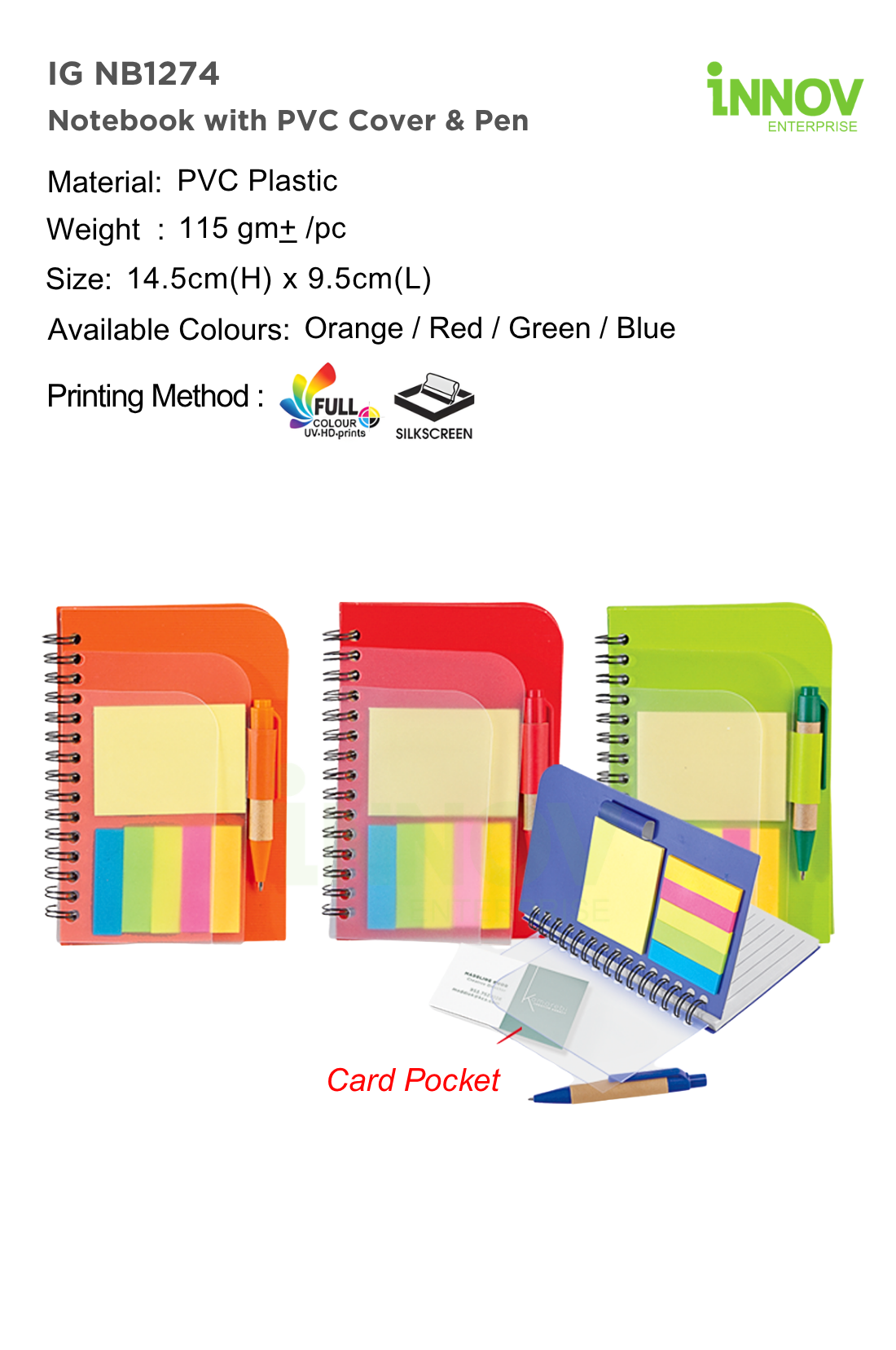 The IG NB1274 Notebook with PVC Cover & Pen is a functional Spiral Custom Notebook with Logo ideal for corporate promotions, events, and daily use. Supplied and customised by Innov Enterprise, it measures 14.5 cm × 9.5 cm with an approximate weight of 115 g, making it compact and easy to carry.