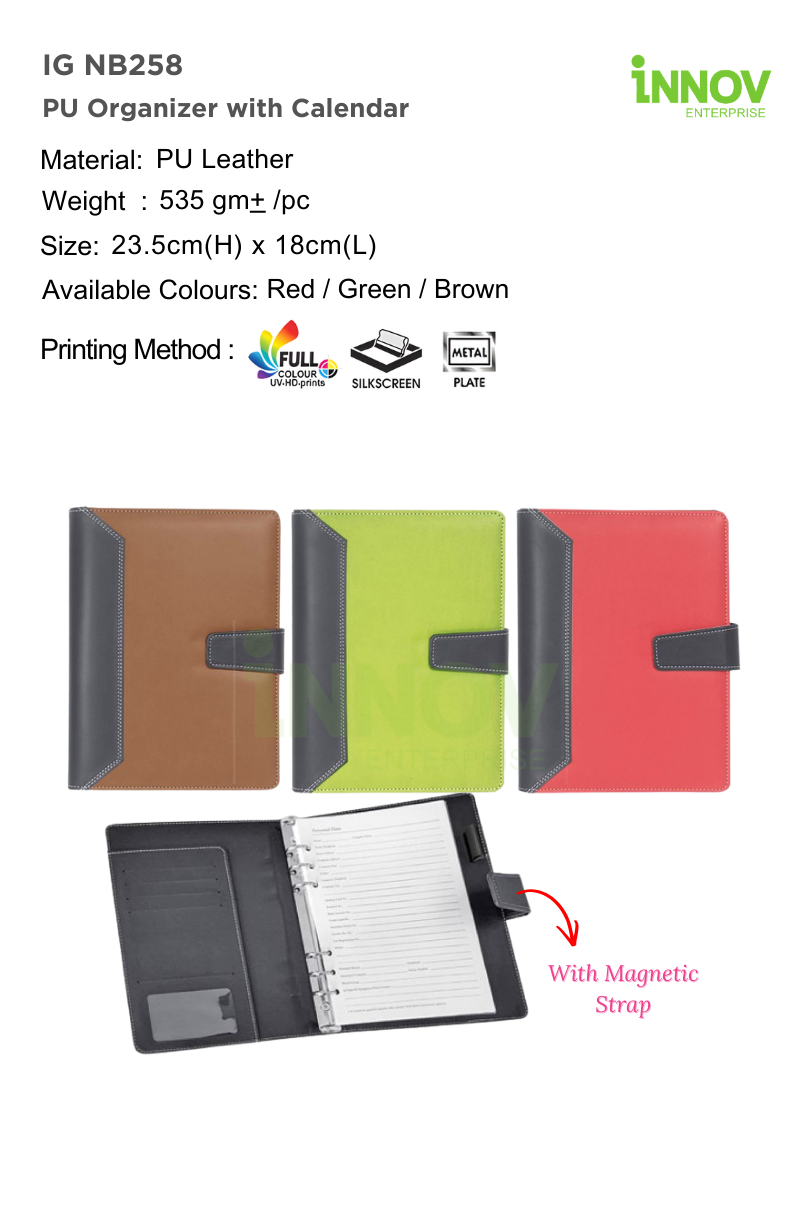 The IG NB258 PU Organizer with Calendar is a professional Custom Leather Binder ideal for corporate branding, office organisation, and executive gifts. Supplied and customised by Innov Enterprise, it is made from durable PU leather and measures 23.5 cm (H) × 18 cm (L) with an approximate weight of 535 g.