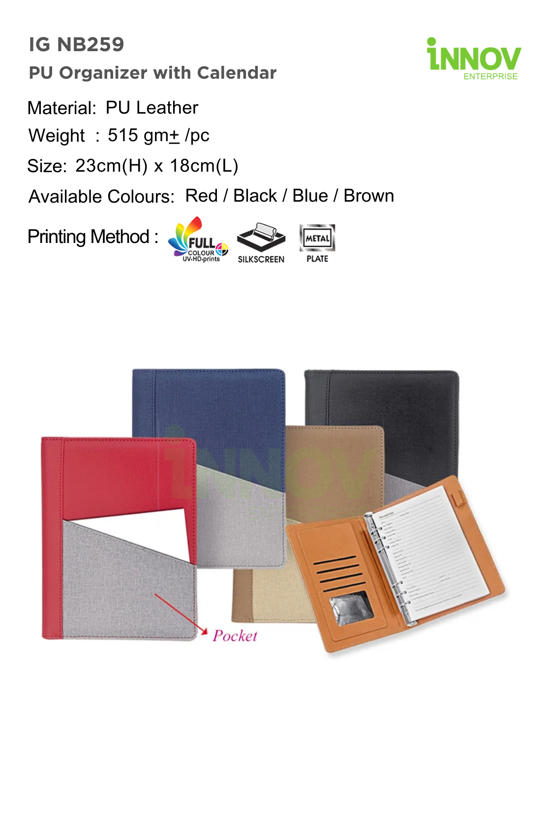 The IG NB259 PU Organizer with Calendar is a stylish Custom PU Organizer Binder ideal for corporate branding, office organisation, and promotional gifts. Supplied and customised by Innov Enterprise, it is made from durable PU leather and measures 23 cm (H) × 18 cm (L) with an approximate weight of 515 g.