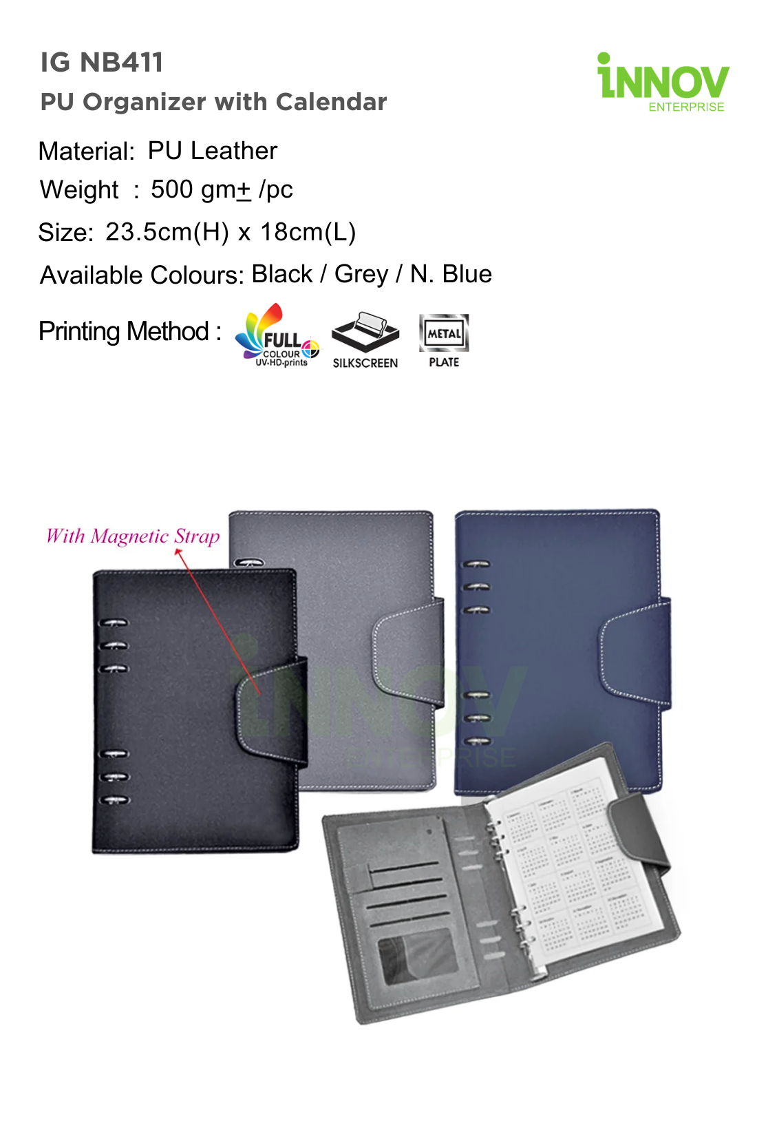 The IG NB411 PU Organizer with Calendar is a professional organiser ideal for executive meetings, office planning, and corporate promotions. Supplied and customised by Innov Enterprise, it is made from durable PU leather and measures 23.5 cm (H) × 18 cm (L) with an approximate weight of 500 g.