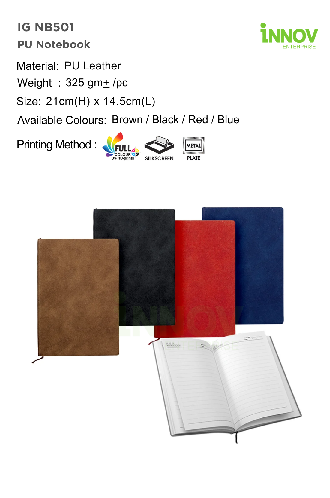 The IG NB501 PU Notebook is a premium Custom Leather Journal for Gift, ideal for corporate professionals, executive meetings, and high-value gifting. Supplied and customised by Innov Enterprise, it measures 21 cm × 14.5 cm with an approximate weight of 325 g, offering a sturdy and comfortable writing experience.