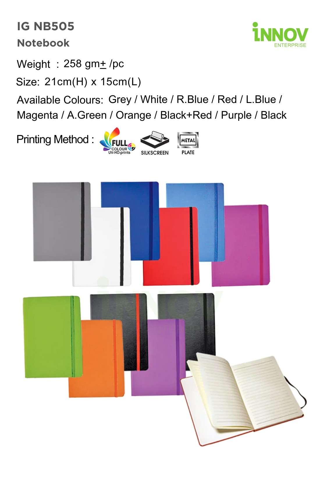 The IG NB505 Notebook is a vibrant Personalised Notebooks with Logo option ideal for corporate gifting, events, and daily office use. Supplied and customised by Innov Enterprise, it measures 21 cm × 15 cm with an approximate weight of 258 g, making it lightweight and easy to carry.