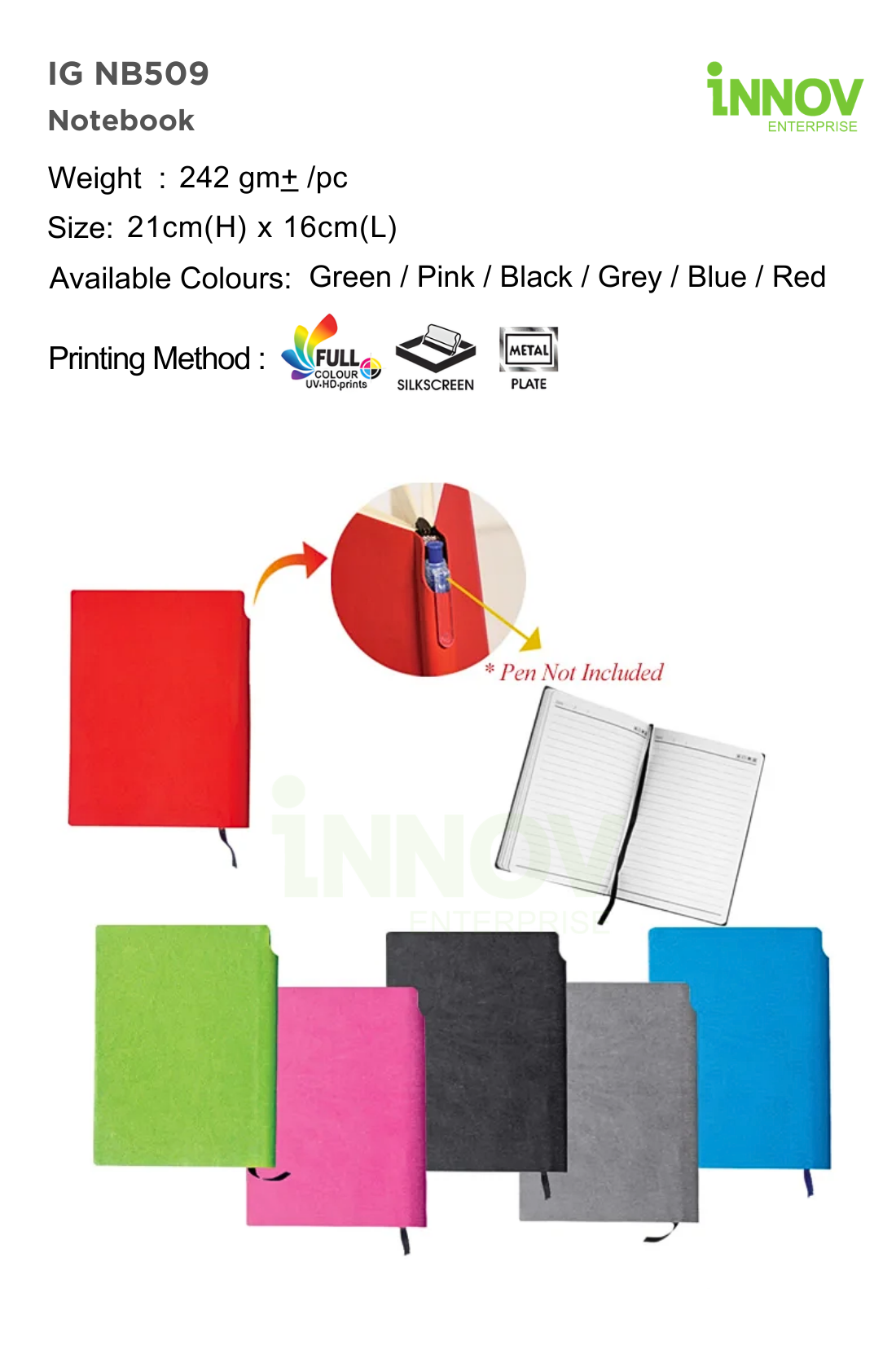 The IG NB509 Notebook is a vibrant option for Notebooks with Logo, ideal for corporate branding, events, and daily office use. Supplied and customised by Innov Enterprise, it measures 21 cm × 16 cm with an approximate weight of 242 g, making it lightweight and easy to carry.