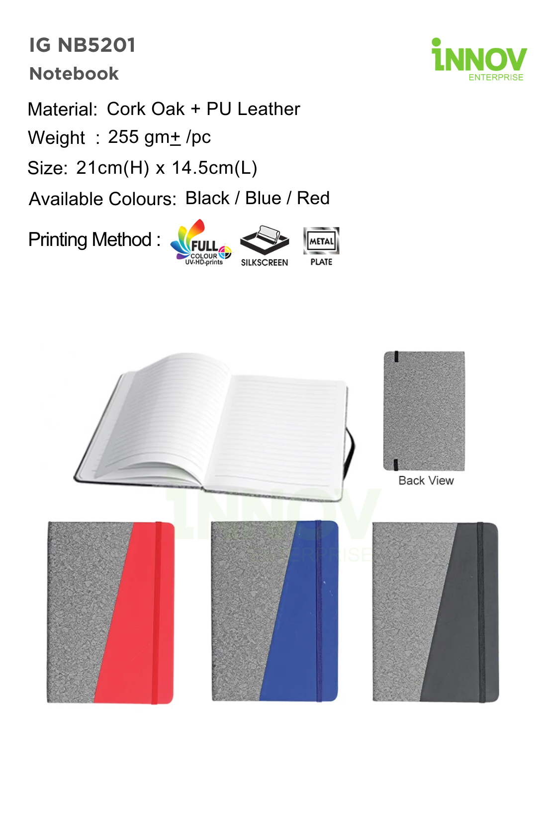 The IG NB5201 Notebook is a modern Eco Notebook with Logo ideal for corporate promotions, meetings, and sustainable branding. Supplied and customised by Innov Enterprise, it measures 21 cm × 14.5 cm with an approximate weight of 255 g, making it lightweight and easy to carry.