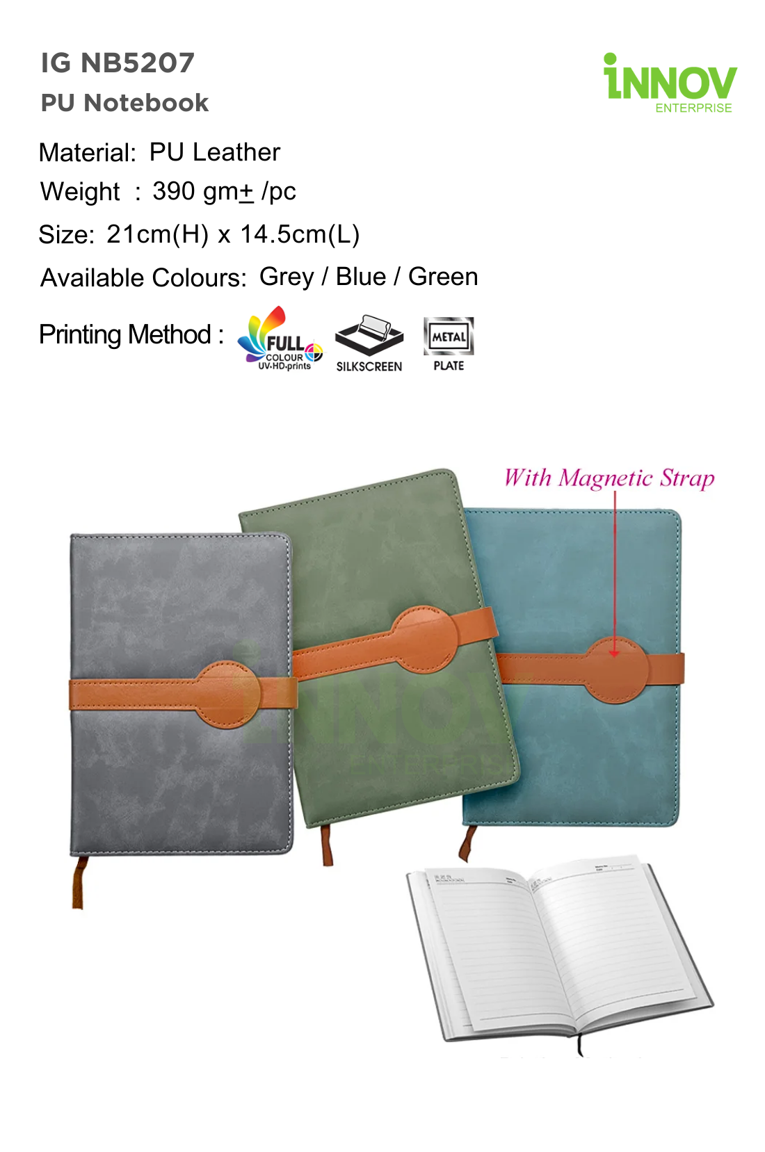 The IG NB5207 PU Notebook is a stylish Leather Notebook with Logo ideal for corporate branding, meetings, and promotional events. Supplied and customised by Innov Enterprise, it is made from high-quality PU leather and measures 21 cm (H) × 14.5 cm (L) with an approximate weight of 390 g.