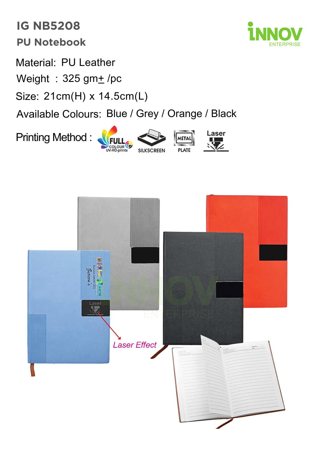 The IG NB5208 PU Notebook is a sleek notebook ideal for leather notebook printing, corporate branding, and promotional events. Supplied and customised by Innov Enterprise, it is made from premium PU leather and measures 21 cm (H) × 14.5 cm (L) with an approximate weight of 325 g.
