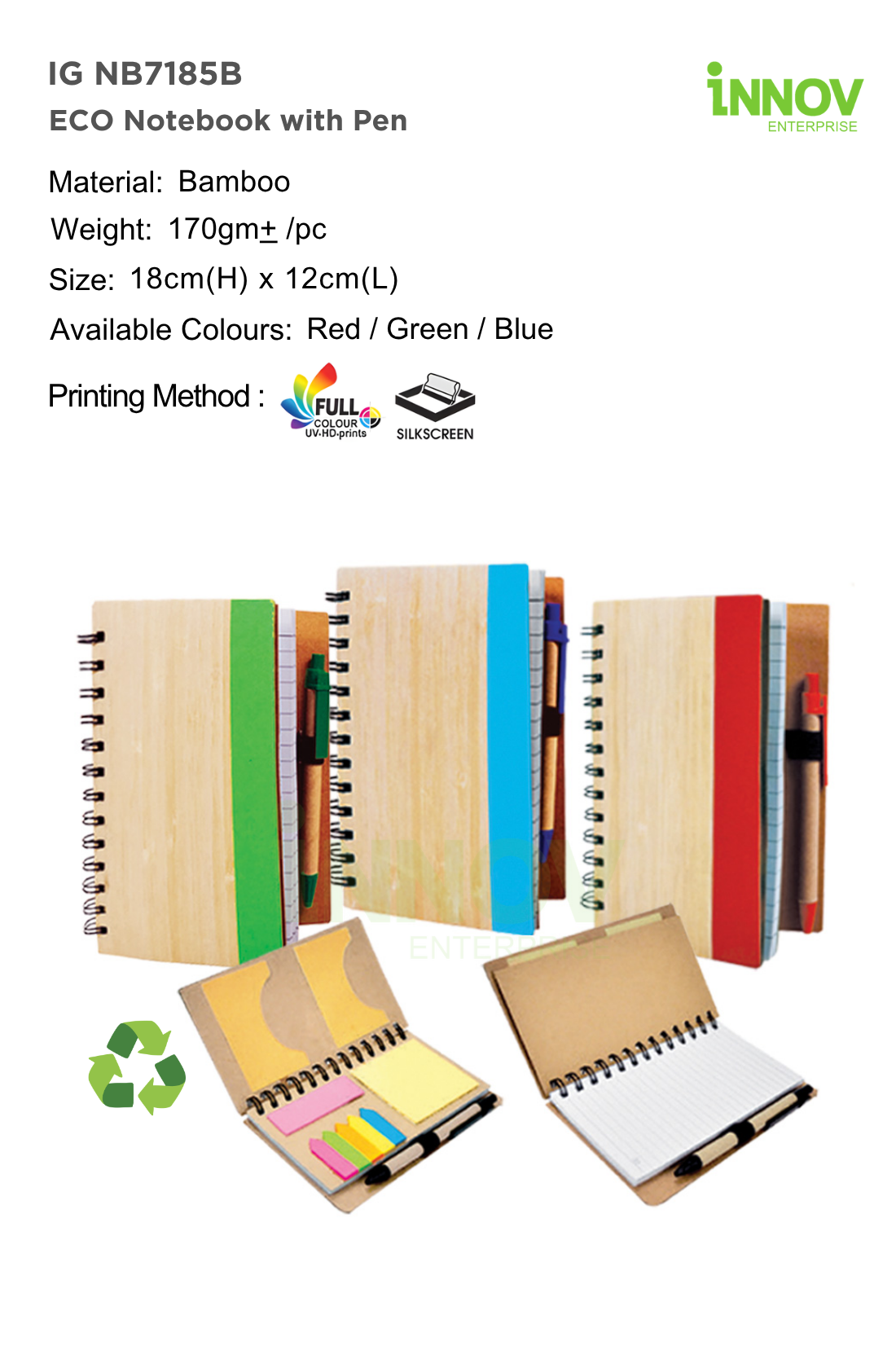 Featuring a natural bamboo cover available in three colours, sticky notes, page markers, spiral binding, and pen holder with pen, it provides a premium eco-friendly surface for branding—perfect for meetings, events, and promotional campaigns.