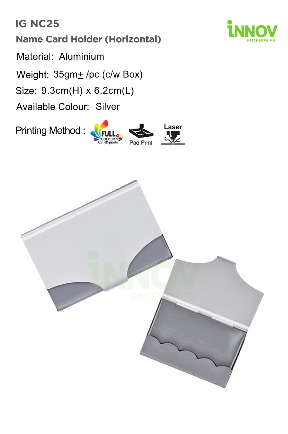 The IG NC25 Name Card Holder (Horizontal) is a sleek Personalised Aluminium Name Card Holder ideal for professionals and corporate use. Supplied and customised by Innov Enterprise, it is made from durable aluminium and weighs approx. 35 g, offering lightweight protection for business cards.
