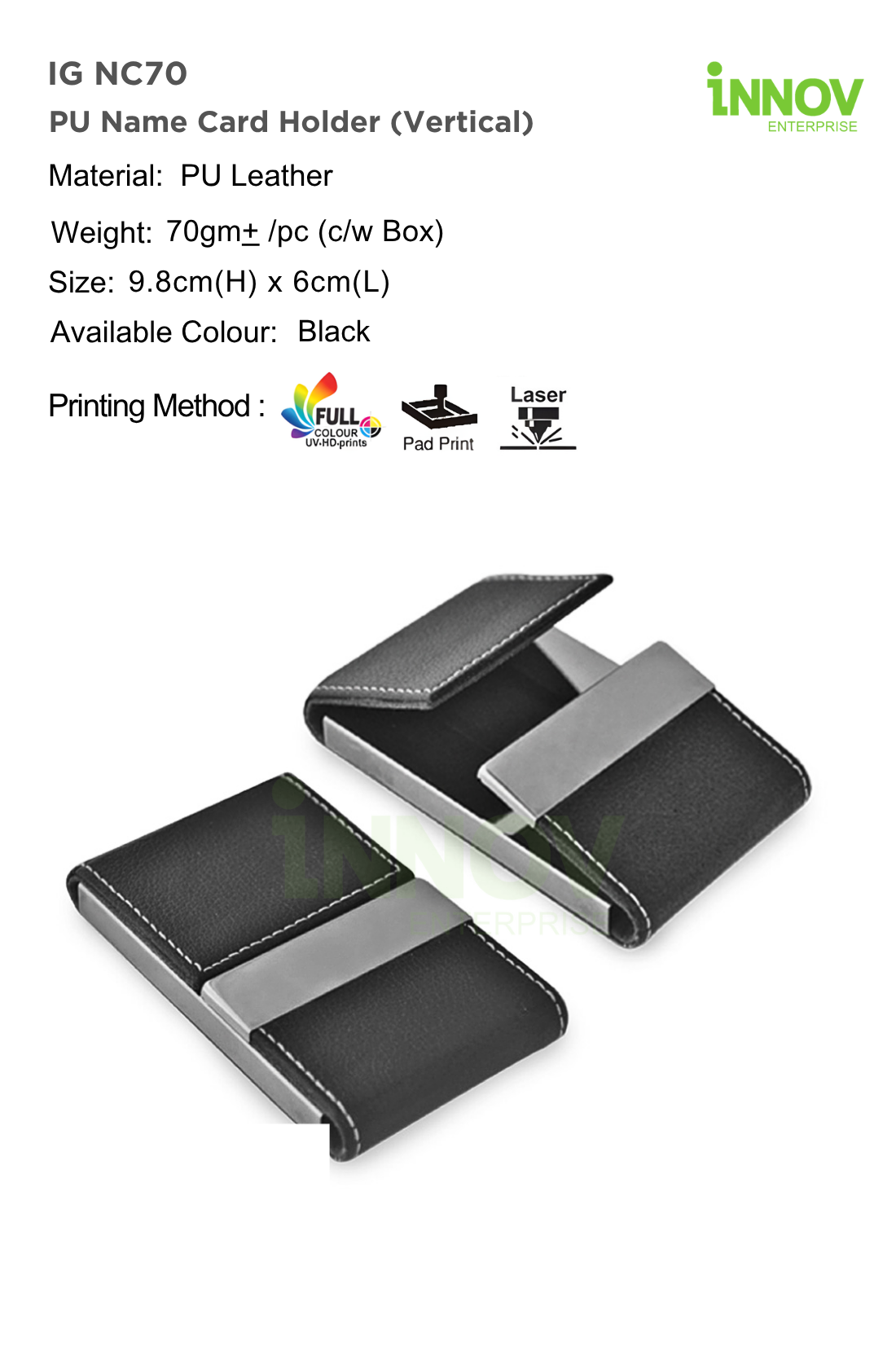 The IG NC70 PU Name Card Holder (Vertical) is a sleek Leather Name Card Holder with Logo ideal for modern corporate use. Supplied and customised by Innov Enterprise, it is crafted from high-quality PU leather and weighs approx. 70 g (with box), offering a durable and premium finish.