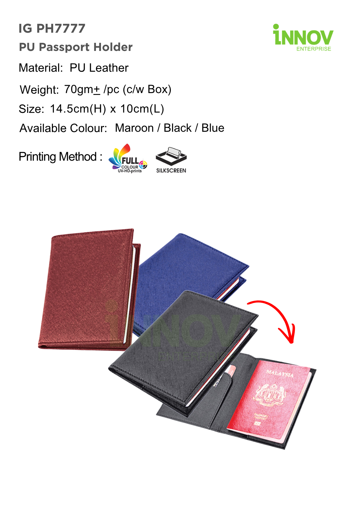 The IG PH7777 PU Passport Holder is a sleek Custom Leather Passport Holder ideal for travel and corporate branding. Supplied and customised by Innov Enterprise, it is crafted from high-quality PU leather and weighs approx. 70 g, offering a lightweight and durable design.