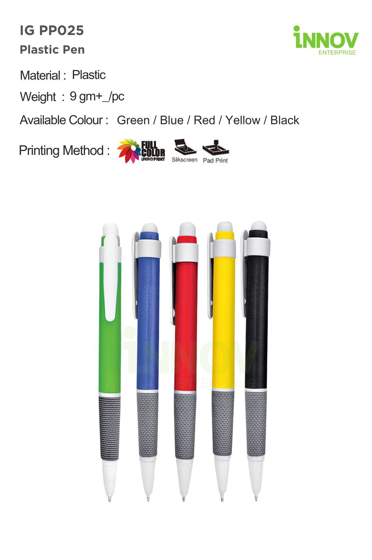 The IG PP025 Plastic Pen is a reliable and versatile writing instrument ideal for businesses looking for Personalized Writing Pens for daily work and corporate gifting. Designed with a retractable click mechanism, solid colour barrel, and a textured grey rubber grip, this pen balances comfort, durability, and brand visibility.