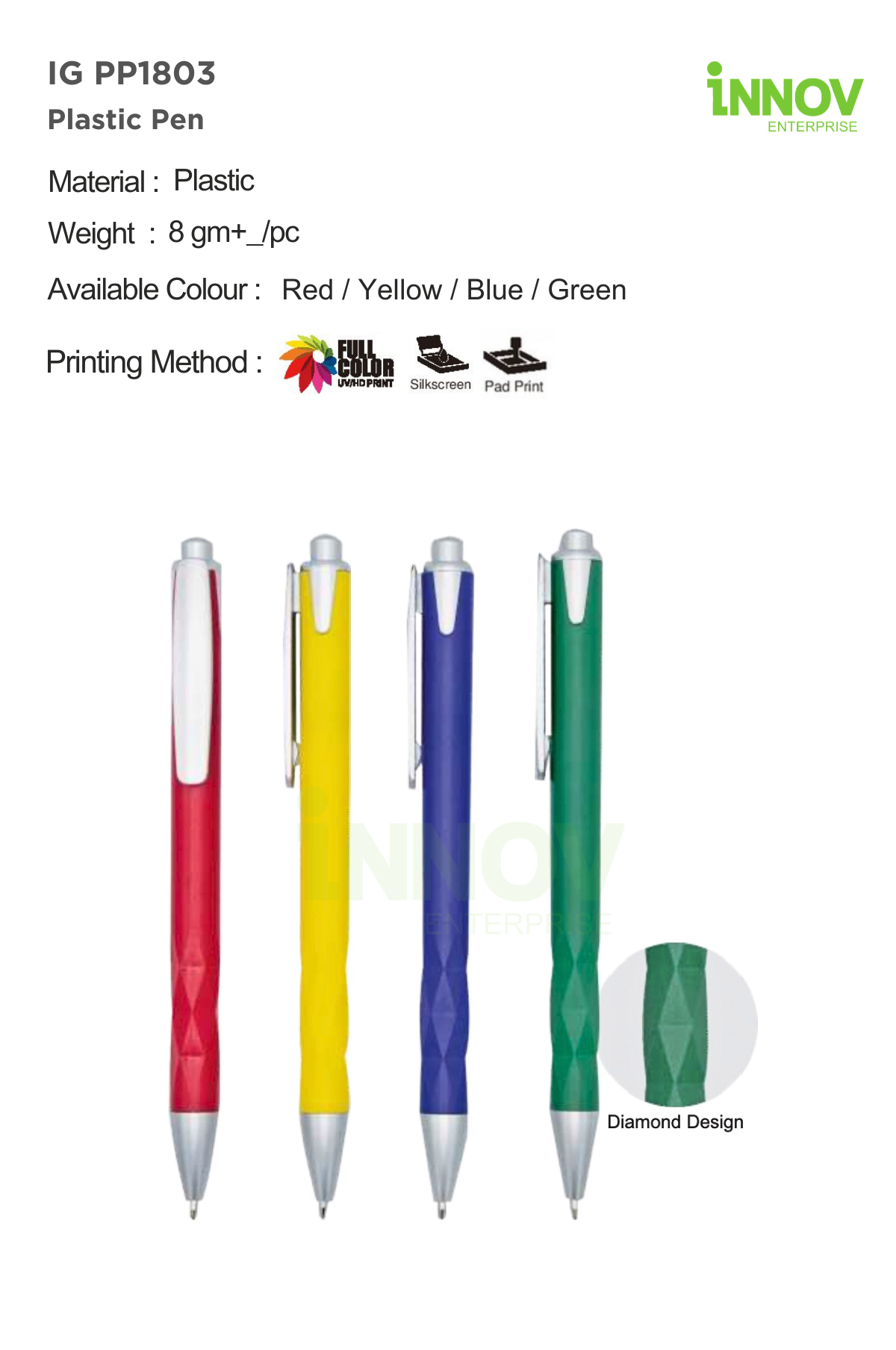 The IG PP1803 Plastic Pen is a vibrant and eye-catching writing solution offered by Innov Enterprise, ideal for businesses looking to highlight their Custom Pen Logo in a practical yet distinctive way. Designed with a unique diamond-patterned grip, this pen provides improved handling and comfort compared to standard smooth barrels, helping users maintain better control during longer writing sessions—especially useful for events, registrations, and daily office use.