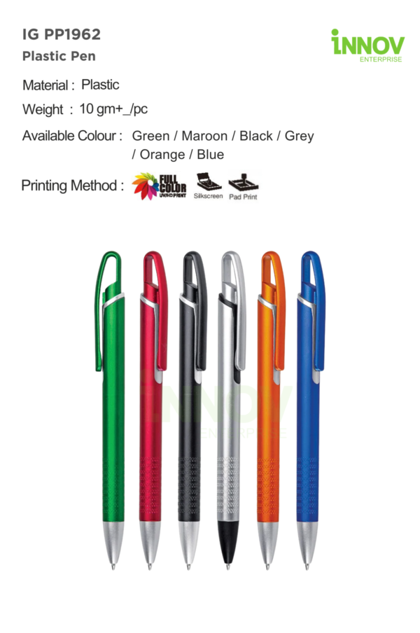 The IG PP1962 Plastic Pen is a versatile and professional writing solution ideal for organisations looking for a Custom Pen with Company Logo that balances everyday usability with strong brand visibility. Featuring a slim plastic body with a textured grip section and a contrasting clip design, this pen offers improved writing comfort while presenting a clean, modern appearance suitable for large-scale distribution. Innov Enterprise offers full customisation services to ensure your branding is applied clearly and professionally on every pen.