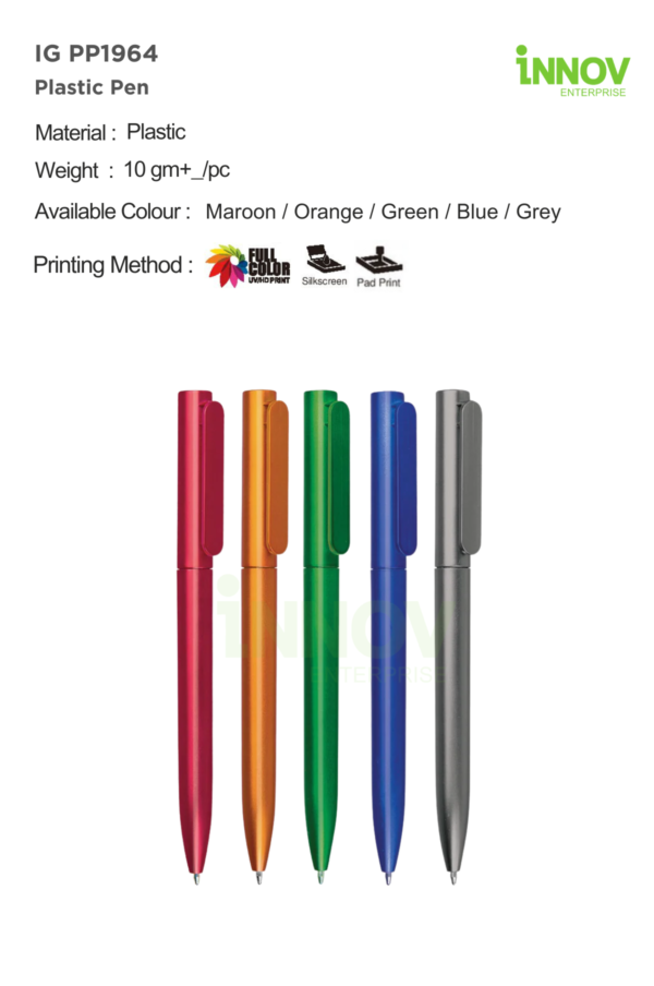 The IG PP1964 Plastic Pen is a sleek and modern writing instrument ideal for businesses searching for a reliable Custom Pen Maker Online solution. Designed with a slim, straight barrel and a smooth metallic-look plastic finish, this pen delivers a more refined appearance compared to standard glossy plastic pens—making it suitable for professional environments, client-facing use, and corporate gifting.