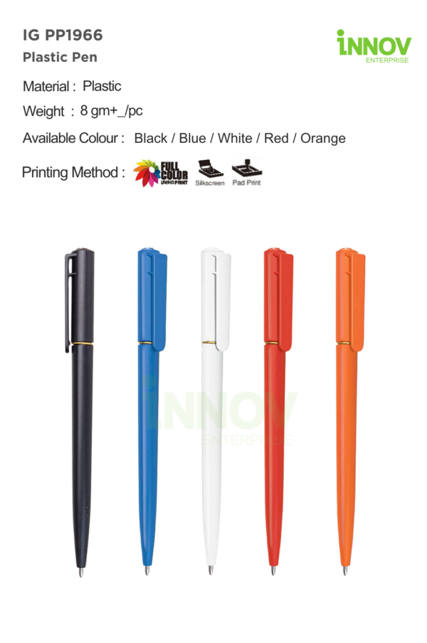 The IG PP1966 Plastic Pen is a slim and lightweight writing solution ideal for businesses looking for dependable Personalized Plastic Pens for daily use and promotional distribution. Crafted from durable plastic and weighing approximately ±8g per piece, this pen offers comfortable handling for extended writing, making it suitable for offices, seminars, exhibitions, and large-scale branding campaigns.