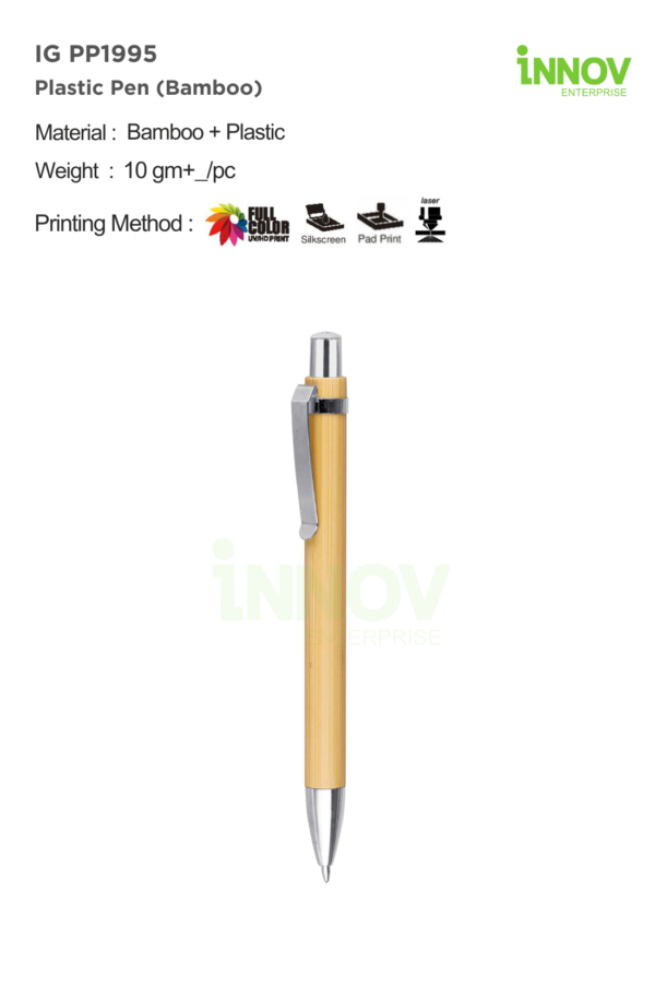 The IG PP1995 Plastic Pen (Bamboo) is a lightweight and eco-conscious Custom Bamboo Pen designed for organisations that value sustainability without compromising everyday practicality. Crafted from a combination of natural bamboo and durable plastic, this pen offers a warm, natural appearance paired with reliable writing performance. Innov Enterprise offers full customisation, allowing your brand message to be presented clearly while supporting environmentally responsible initiatives.