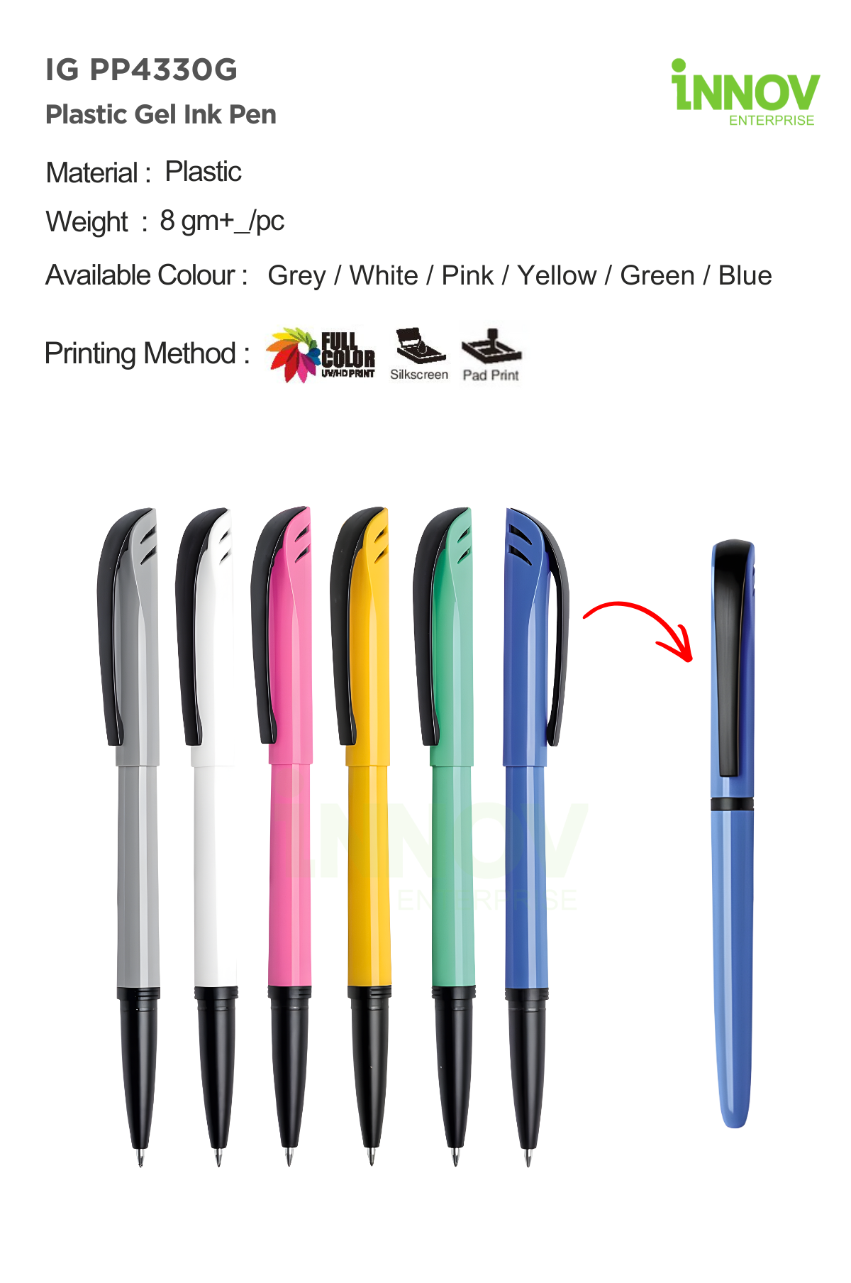 With a lightweight build of approximately ±8g per piece, the IG PP4330G is especially suitable for bulk distribution without adding weight or cost. Available in 6 colours, the assorted colour options help brands stand out while maintaining a clean, professional appearance. Innov Enterprise provides reliable custom branding to turn this pen into an effective and visible promotional tool.